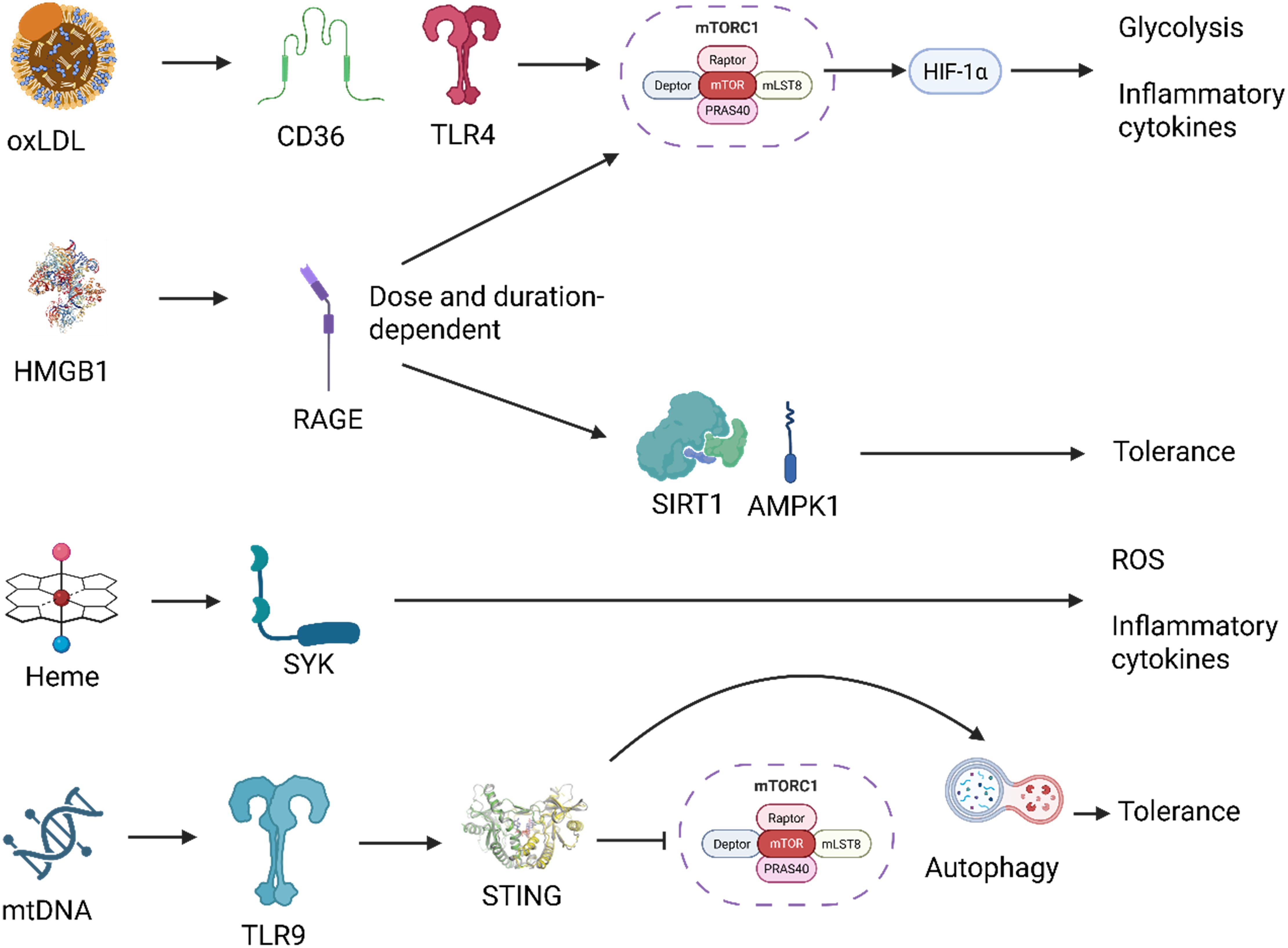 Figure 6. Distinct signaling pathways downstream of DAMPs mediate context-specific innate immune reprogramming. Damage-associated molecular patterns (DAMPs) activate unique receptor-mediated pathways that converge on distinct metabolic and transcriptional responses. For example, oxidized LDL (oxLDL) signals through CD36 and TLR4, activating the mTOR-HIF-1α axis and promoting trained immunity characterized by glycolysis and pro-inflammatory cytokine production. HMGB1, depending on dose and context, activates RAGE, leading to either AMPK/SIRT1-mediated tolerance or mTOR-driven training. Heme triggers SYK kinase signaling, driving reactive oxygen species (ROS) generation and a trained phenotype via a mTOR-independent route. Mitochondrial DNA (mtDNA) is sensed via TLR9, engaging the STING pathway, which intersects with autophagy and inhibits mTOR, promoting an autophagy-high, tolerant state. These divergent signaling routes illustrate how specific DAMPs imprint tailored innate immune memory programs depending on receptor usage, signal integration, and cellular context. Created with BioRender.com.