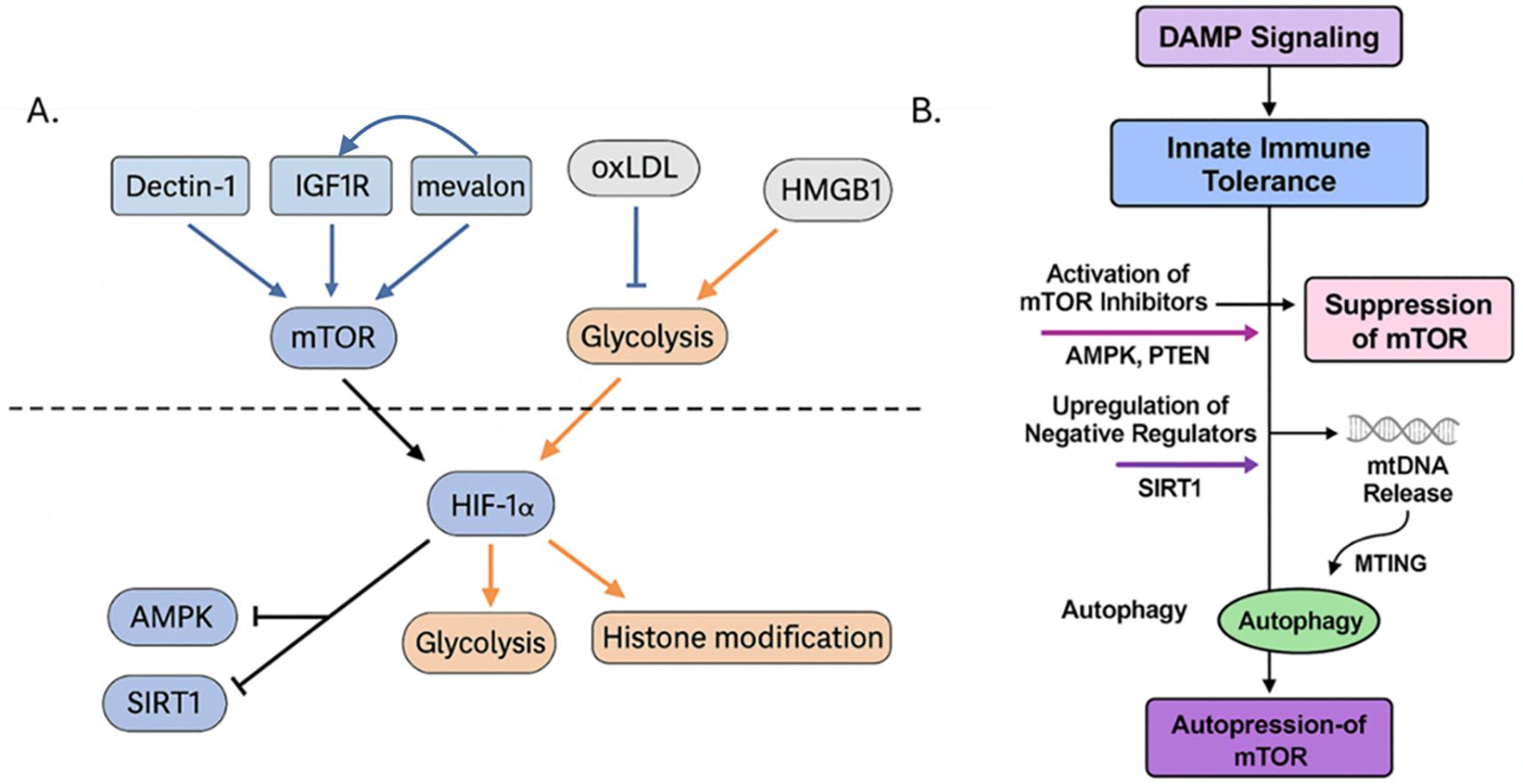 Figure 7. (A) The mTOR signaling axis integrates metabolic and epigenetic cues to regulate trained versus tolerized innate immune states. This diagram illustrates the central role of the mechanistic target of rapamycin (mTOR) in determining whether innate immune cells adopt a trained or tolerized phenotype following DAMP stimulation. Upstream activators such as oxLDL engages CD36/TLR4 and enhances IGF1R signaling via mevalonate (“mevalon”) accumulation, leading to PI3K–AKT–mTOR activation. Dectin-1, often engaged by fungal β-glucan and possibly some DAMPs, also activates mTOR via Syk and downstream AKT. Downstream of mTOR, activation of HIF-1α, glycolysis, and histone acetylation/methylation (e.g., H3K4me3, H3K27ac) leads to enhanced inflammatory gene transcription and the trained immunity phenotype. Various negative feedback and inhibitory loops exist; for example, in tolerized states, AMPK, SIRT1, and STING/autophagy pathways are activated by cellular stress, energy depletion, or chronic DAMP signaling (e.g., high-dose HMGB1 or mtDNA), which suppress mTOR activity. (B) Key inhibitory nodes are activated, such as AMPK and PTEN, which directly suppress mTOR activity, and SIRT1, are activated that are negative regulators that promote a tolerogenic program. In parallel, mitochondrial DNA (mtDNA) release during cellular stress activates STING and related pathways, which further inhibit mTOR through mitochondrial training-induced genes (MTING) and enhance autophagy. Together, these processes reinforce a feedback loop of autophagy-driven mTOR repression, leading to sustained immune tolerance and reduced inflammatory responsiveness. This promotes oxidative metabolism, histone deacetylation or repression, and reduced cytokine expression, resulting in immune tolerance. Created with BioRender.com.