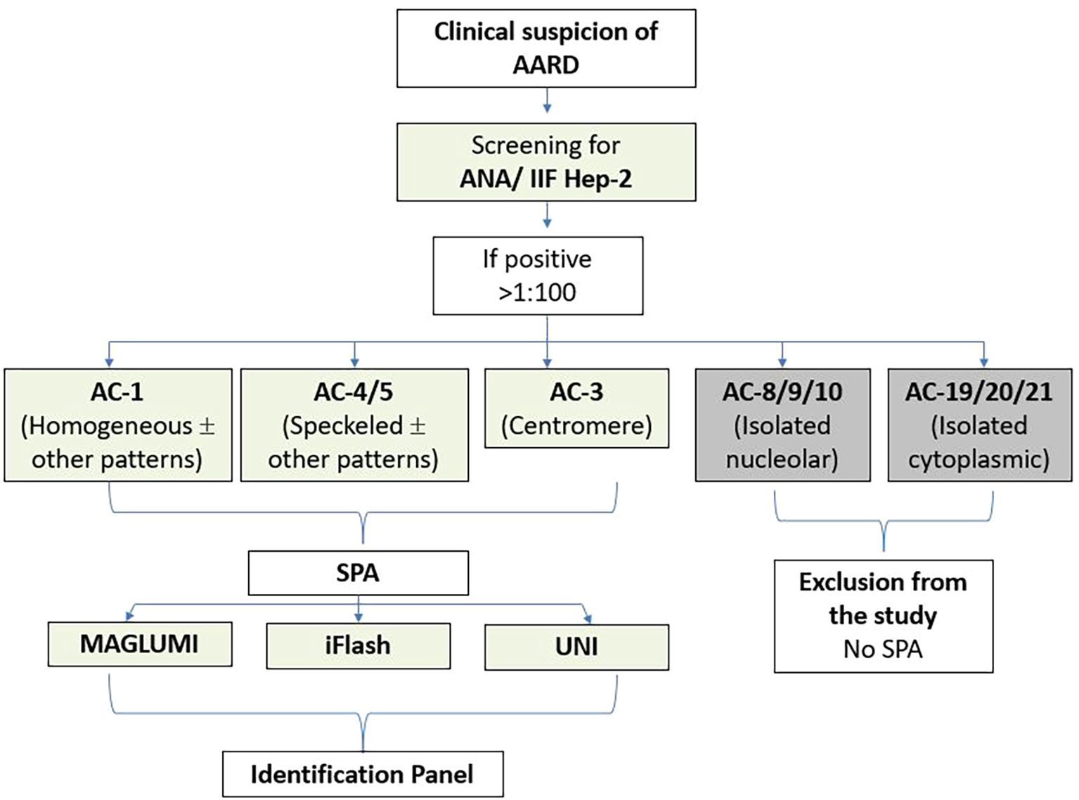 Figure 1. Diagram of the study protocol. AARD, antinuclear antibody-associated rheumatic disease; IIF, indirect immunofluorescence; SPA, solid phase assays. ANA, Anti-nuclear antibodies; HEp-2, Human Epithelial cells type 2.
