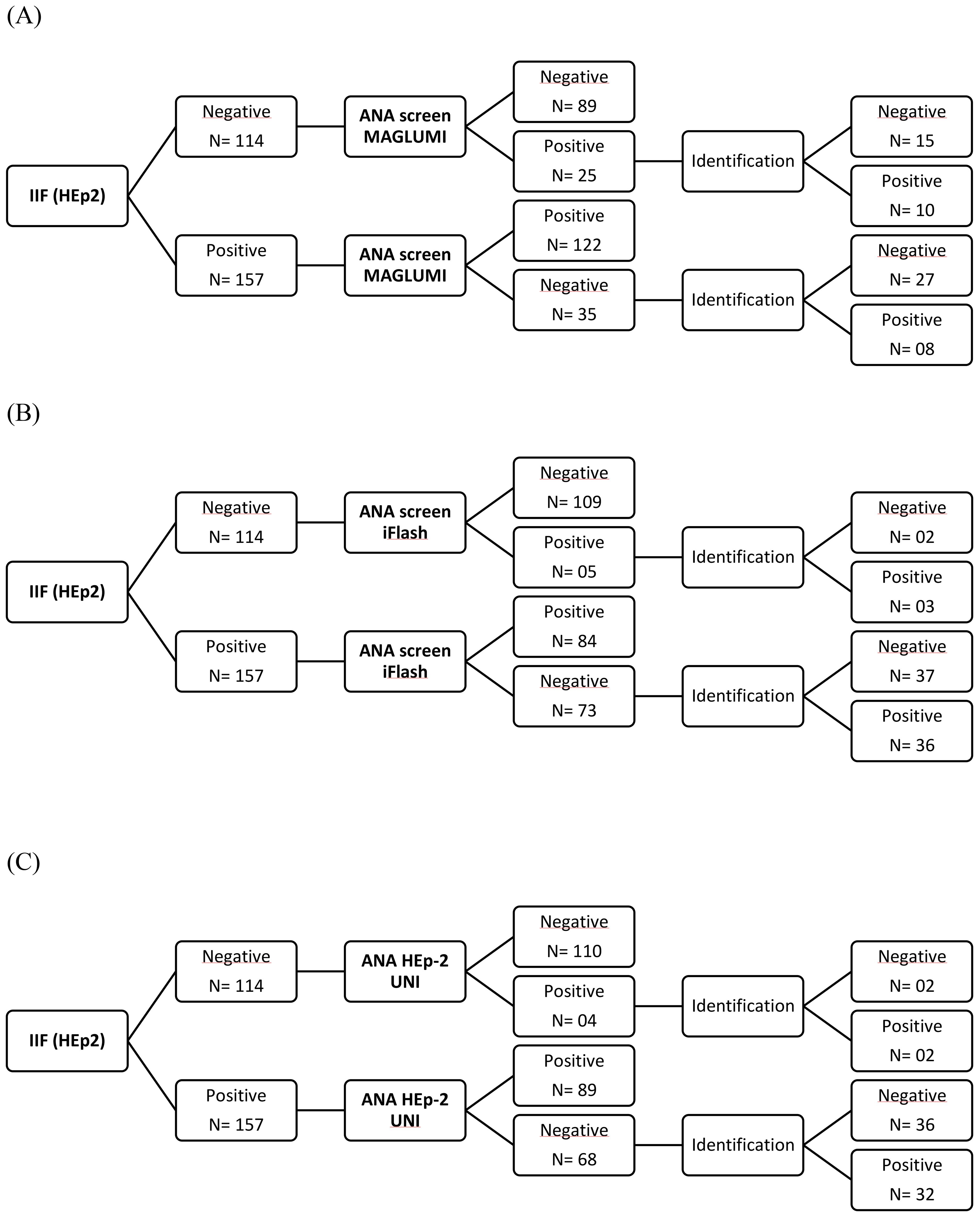 Patients and methods: This study included 271 patients referred to our department for routine ANA testing: 94 patients with confirmed AARD, 144 in whom AARD was excluded and 33 with an uncertain AARD diagnosis. For all sera, ANA detection was initially performed using an IIF HEp-2 assay (EUROIMMUN®, Lubeck, Germany), then assessed by two chemiluminescence immunoassays (CLIAs) on the MAGLUMI® X3 (Snibe, Shenzhen, China) and the iFlash 1800® (YHLO, Shenzhen, China), and an automated enzyme immunoassay (EIA) UNI® (NeoMedica, Nis, Serbia). For identification, we performed anti-ENA and anti-DNA assays using the CLIA MAGLUMI® X3 or the ELISA EUROIMMUN® assay.