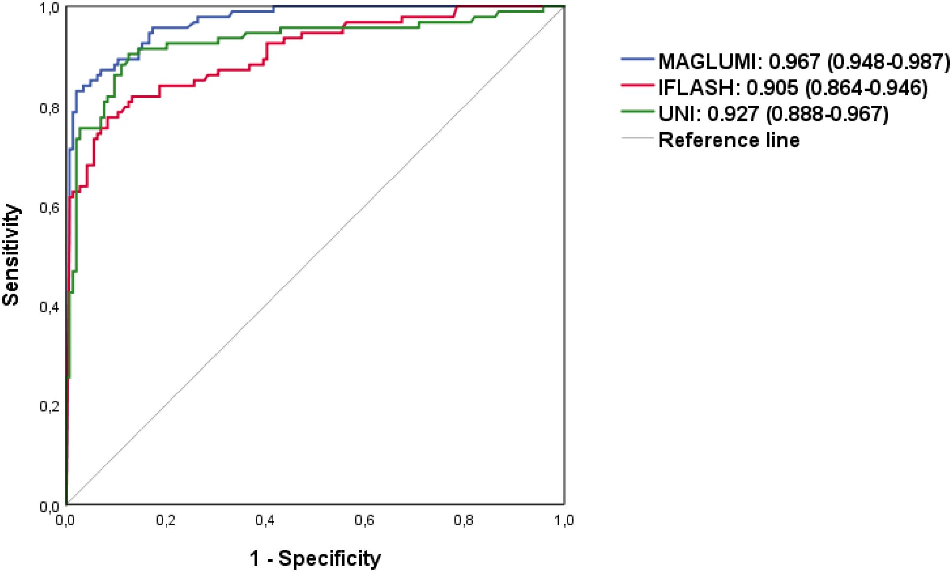 Using the ROC curve analysis (Figure 3), we determined optimal cut-offs for each test allowing a variation of sensitivity, the highest with the UNI assay (90.4%) at a cut-off of 6.2 U/mL, followed by the MAGLUMI assay with a sensitivity of 83% at 227.5 AU/mL, followed by iFlash (75.5%) at a cut-off value of 30.9 AU/mL. The specificities were 97.9% for the MAGLUMI assay, 93.1% for the iFlash assay and 87.5% for the UNI assay.