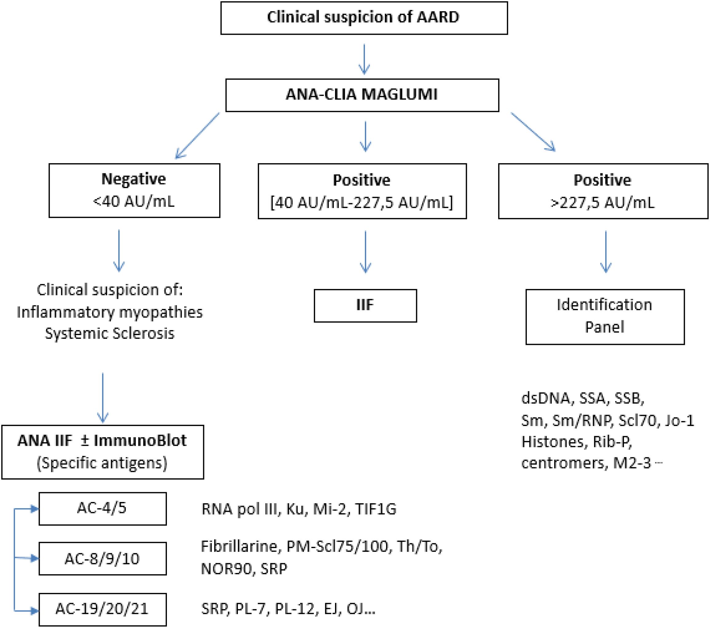 An algorithm combining the IIF assay with the SPA assays has already been proposed in other studies (1–3, 10) which even provided proof of an improvement in the cost/benefit ratio for the diagnosis of AARD (26), concluding that the SPA can be advantageously associated with IIF when the ANA request has a low pre-test probability and when the requests do not report useful clinical information for a targeted disease-oriented search for antibody specificity, a diagnosis strategy that we want to adopt in our laboratory, using the CLIA MAGLUMI assay, which showed the highest sensitivity and it is well adapted to a screening assay (8).