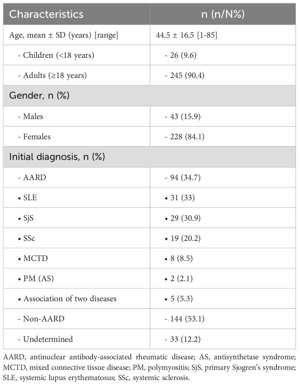 The study population consisted of 271 samples of patients referred to the Immunology Department of Issaad Hassani University Hospital in Algiers for ANA testing during the period between November 2023 and April 2024. Patients were referred from Internal Medicine, Rheumatology, Pneumology and Nephrology departments of the Hospital for follow up or suspicion of AARD and from outpatient consultations for routine medical checkups. Next, the subject’s medical records were retrospectively evaluated by physicians for AARD, resulting in the individualization of 3 groups (Table 1):