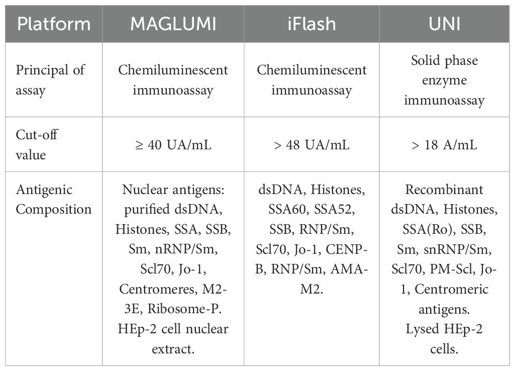 Nowadays, more and more solid phase assays (SPA) for the screening of ANA have emerged. The majority of them have the advantage of being automated, allowing time savings and objectivity in the interpretation of results. Moreover, SPA adopt different technical principles, including chemiluminescence immunoassays (CLIA), enzyme immunoassay (EIA), and multiplex tests. These assays utilize diverse antigenic substrates—such as purified antigens, recombinant antigens, and cell extracts—to enhance sensitivity, a critical factor for screening assays (6–8). Ultimately, SPA are specifically designed to detect autoantibodies associated with ANA-related rheumatic diseases (AARD), thereby improving their diagnostic specificity (6).