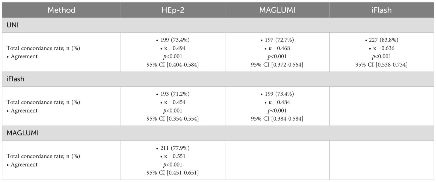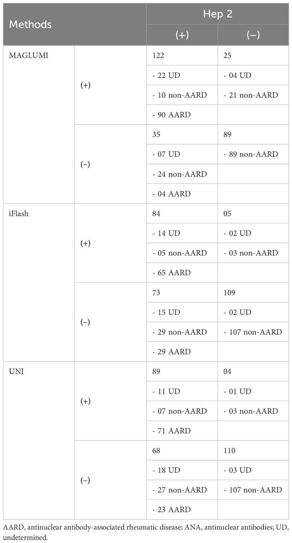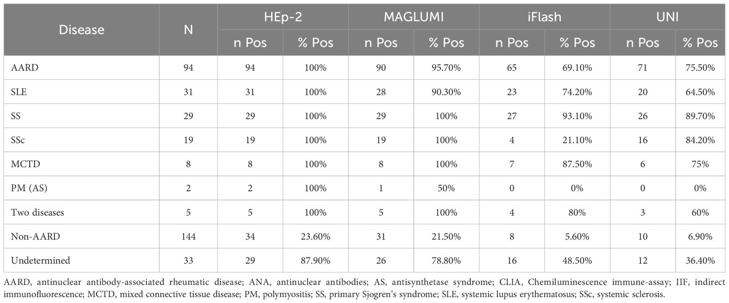 Table 4. Overview of positive rates in each disease group for ANA HEp-2 (IIF), MAGLUMI ANA screen (CLIA), iFlash ANA screen (CLIA) and UNI ANA HEp-2 (EIA).
