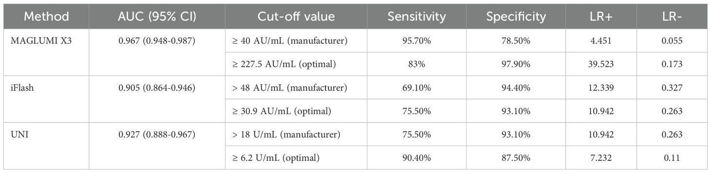 Receiver operating characteristic (ROC) curve analysis was performed. Sensitivity, specificity, likelihood ratios (LRs) and the optimal cut-off value were calculated. Optimal cut-off values for CLIA and automated EIA assays were obtained using the Youden index to optimize combined sensitivity and specificity.