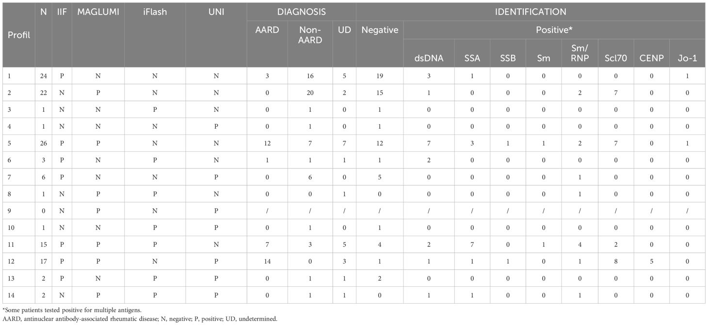 These results, together with the experience acquired using solid-phase screening tests, lead us to believe that a complementary strategy between the IIF and solid-phase assays, particularly CLIA on the MAGLUMI platform, could be valuable for ANA screening in AARD. Performing the automated assay first would save time and help exclude negative patients. Subsequently, the IIF-HEp 2 could be employed in cases of discrepancy with the clinical presentation, with the identification panel and also in cases where the antigen is not represented in the screening assay, particularly some nucleolar antigens associated with systemic sclerosis, antigens linked to inflammatory myopathies and the case of the DFS70 Antigen (19–22). In these situations, the specific immunofluorescence patterns, together with the clinical context, can guide targeted antigen identification. A strategy based on the clinical suspicion, given the multitude of IIF patterns and the antigenic targets associated with each AARD, combined with knowledge of the clinical performance of each assay, is therefore recommended (23). Besides, in some cases of AARD, notably in systemic sclerosis, primary Sjogren’s syndrome and the IPAF entity (Interstitial Pneumonia with Autoimmune Features), the only autoimmune feature detected may be the positivity of ANA at a significant titer without any identified target (24). Such a strategy would have the advantage of avoiding false negatives on the IIF test, particularly with some highly soluble or poorly represented antigens, such as the SSA and Jo-1 targets, provided that these antigens are well represented in the SPA test (2, 6, 8, 25).