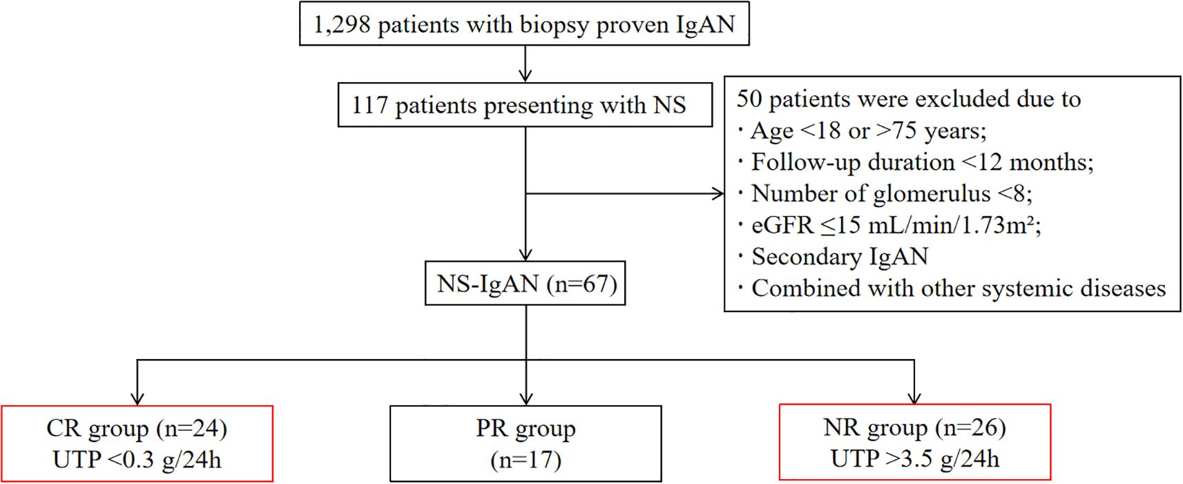 Flowchart of patient selection and classification. Out of 1,298 patients with biopsy-proven IgAN, 117 with NS were identified. Fifty were excluded for reasons including age, follow-up duration, glomerulus count, eGFR, secondary IgAN, or other diseases. Sixty-seven were studied, divided into CR group (24 patients, UTP <0.3 g/24h), PR group (17 patients), and NR group (26 patients, UTP >3.5 g/24h).