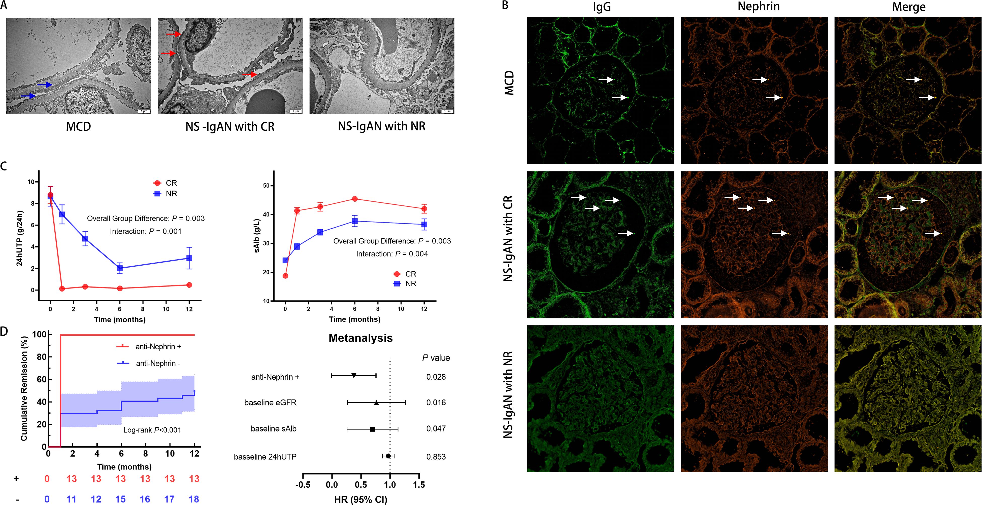 Figure 2. Clinicopathological features of IgA nephropathy with nephrotic syndrome (NS-IgAN). (A) Transmission electron microscopy (TEM) revealing extensive foot process effacement in the complete remission (CR) group (original magnification: ×15,000). (B) Confocal immunofluorescence analysis demonstrating IgG (green) colocalization with nephrin (red) (scale bar = 20μm). Specific IgG-nephrin colocalization (white arrows) was observed in minimal change disease (MCD) and CR groups, but absent in non-remission (NR) specimens. (C) Comparative longitudinal analysis of 24-hour urinary total protein (24hUTP) and serum albumin (sAlb) between CR and NR cohorts. (D) Kaplan-Meier curves for time to complete remission and multivariable Cox proportional hazards regression model (forest plot) identifying anti-nephrin positivity as an independent predictor of accelerated remission. eGFR, estimated glomerular filtration rate.