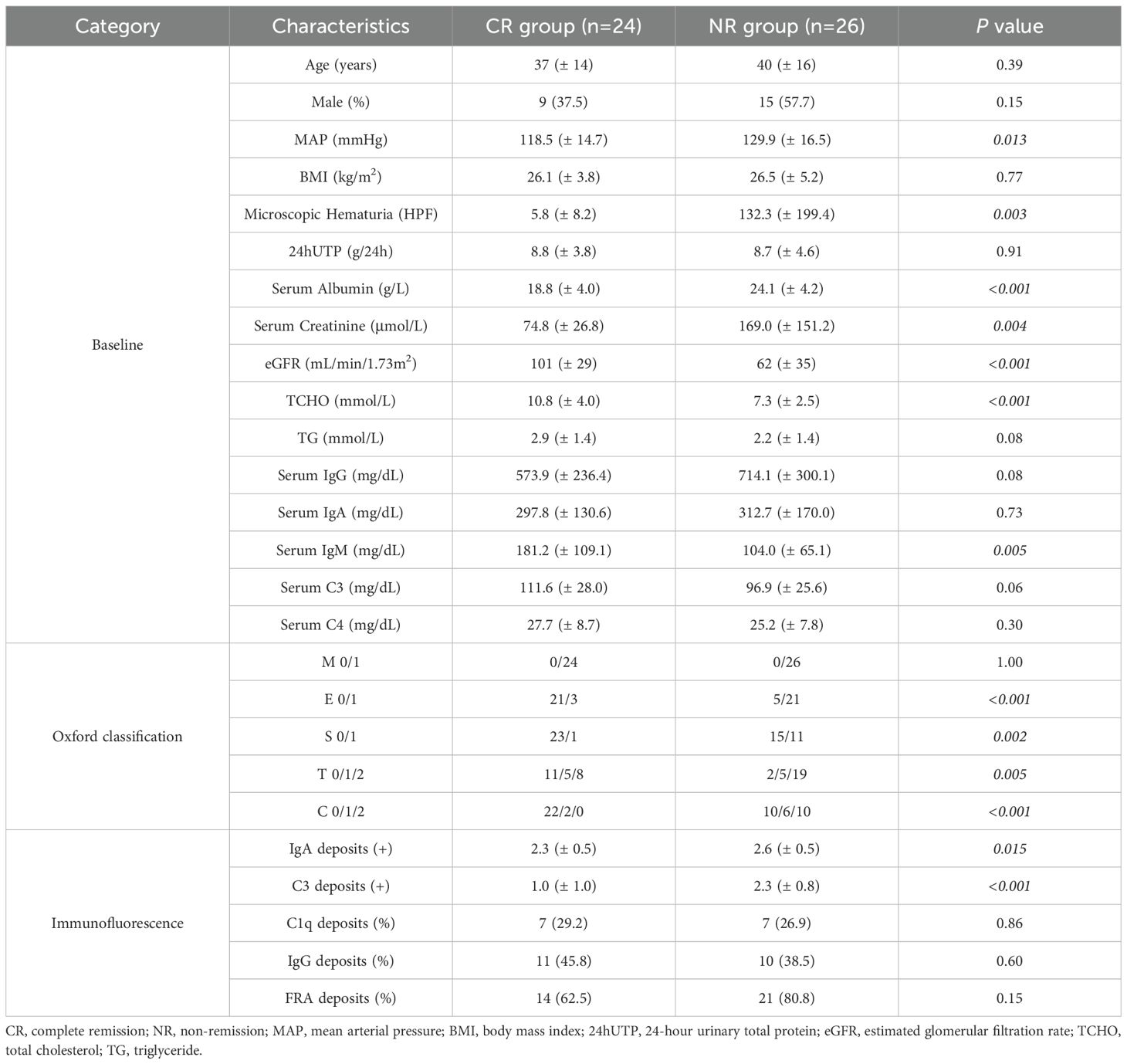 As detailed in Table 1, the CR group exhibited significantly lower baseline serum albumin levels compared to the NR group (18.8 ± 4.0 vs. 24.1 ± 4.2 g/L, P < 0.001), whereas 24hUTP levels showed no intergroup difference. Notably, the CR group demonstrated superior renal function, with significantly higher baseline eGFR (101 ± 29 vs. 62 ± 35 mL/min/1.73m², P < 0.001). No significant disparities were observed in age, sex distribution, or BMI between the two cohorts. Pathological analysis based on the Oxford Classification revealed that the NR group exhibited more severe endocapillary hypercellularity (P < 0.001), higher prevalence of segmental glomerulosclerosis (P = 0.002), more advanced tubular atrophy/interstitial fibrosis (P = 0.005), and significantly increased crescent formation (P < 0.001) compared to the CR group. Immunofluorescence demonstrated significantly lower IgA (P = 0.015) and C3 (P < 0.001) deposition intensity in the CR group, while serum IgA and C3 levels showed no significant intergroup differences, with detailed baseline characteristics and pathological data for the PR group provided in the Supplementary Materials.