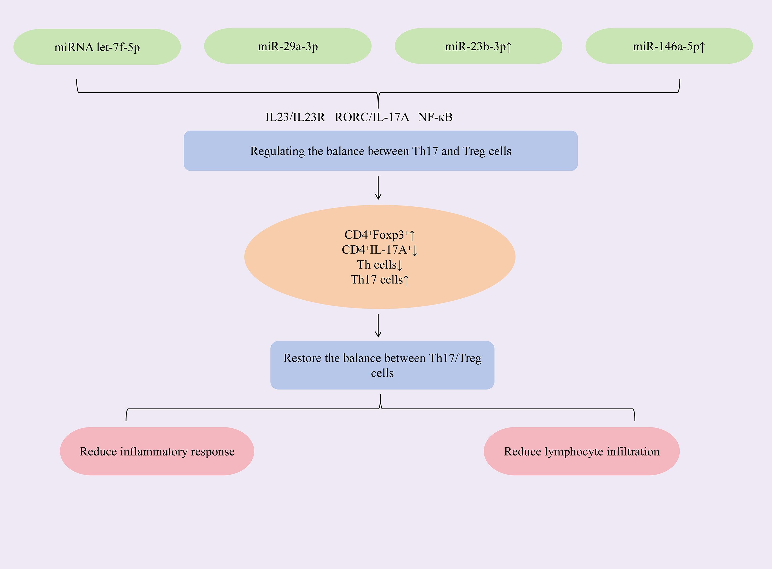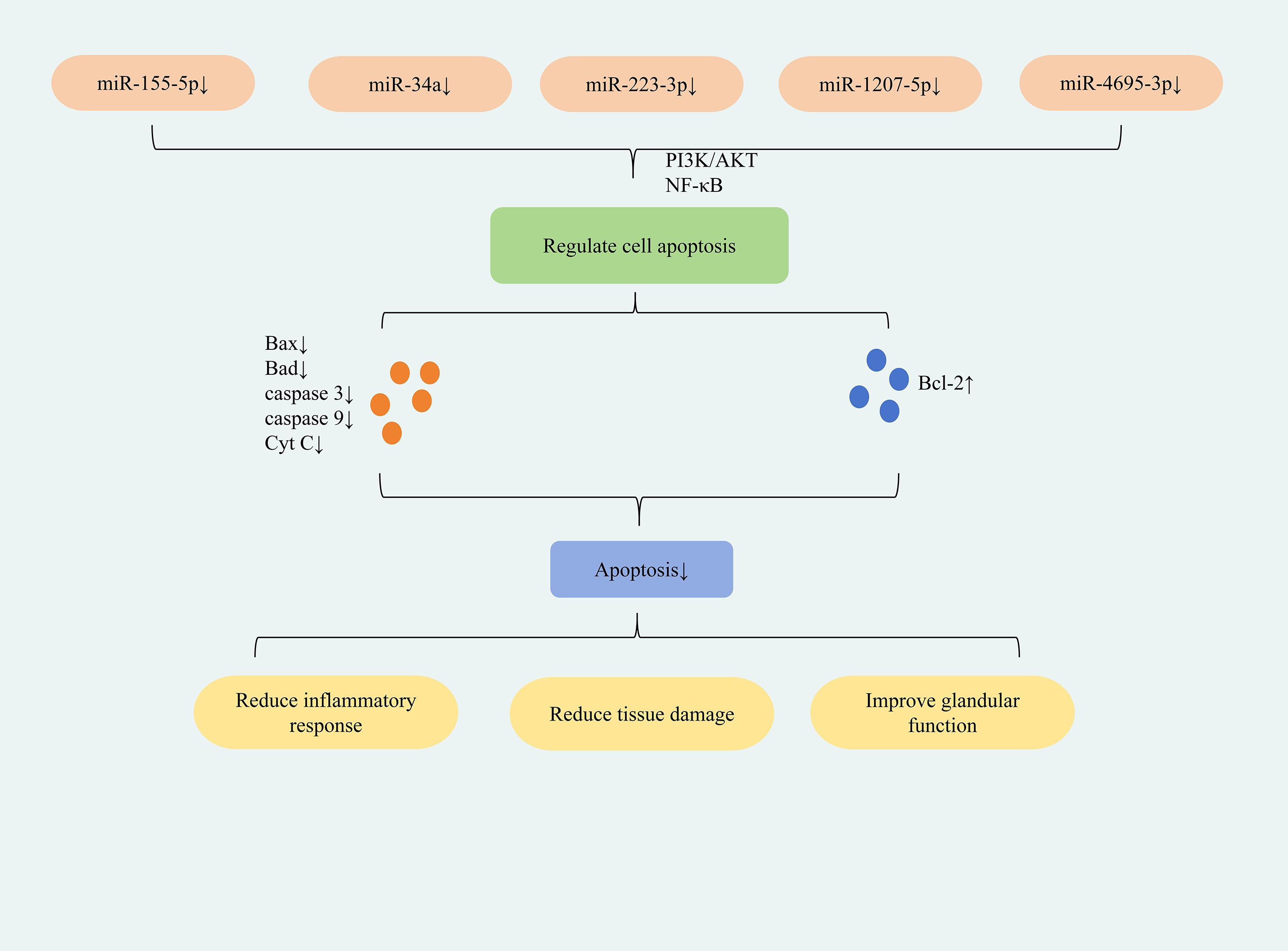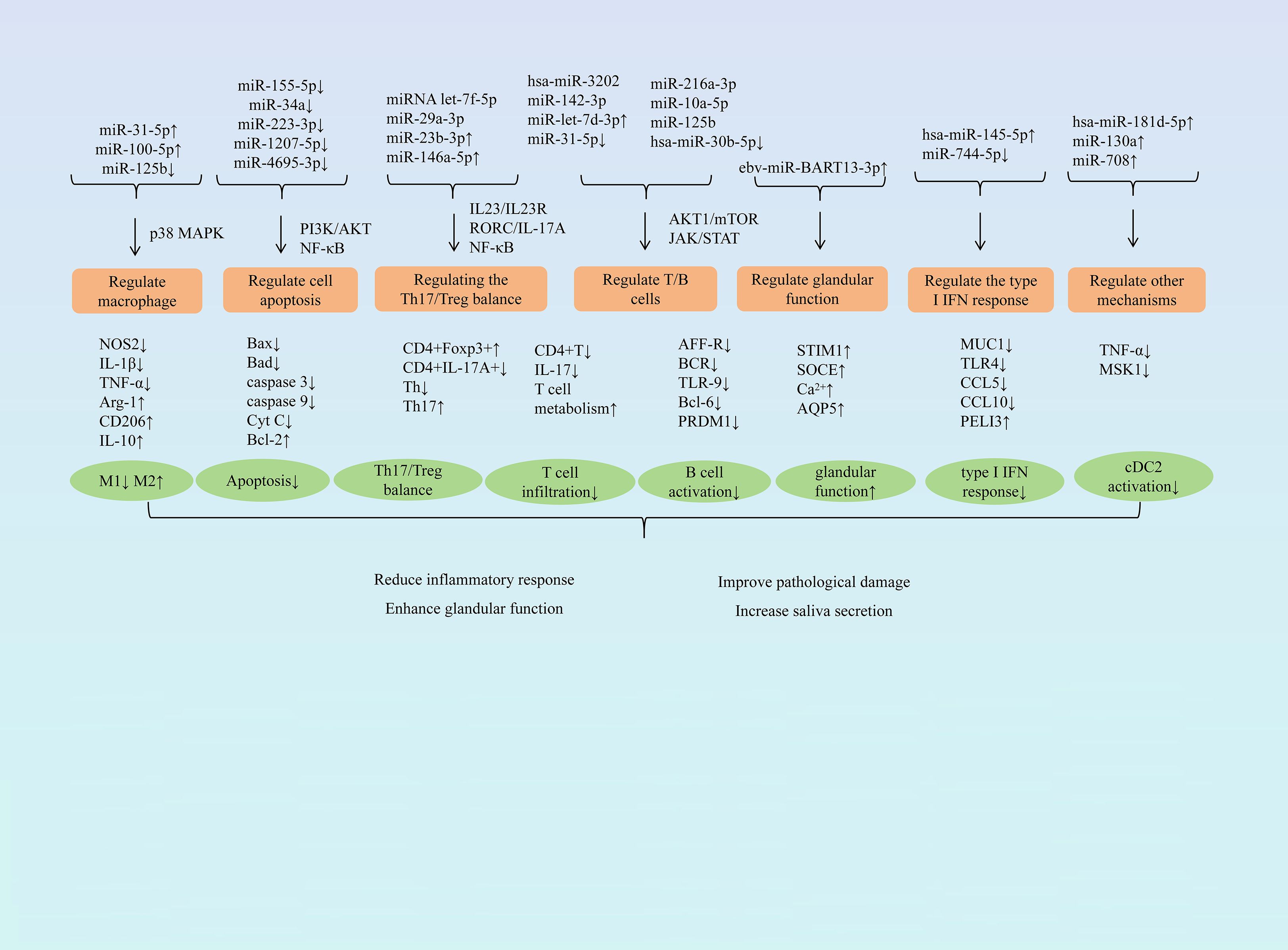 Research has demonstrated that miRNA exerts protective effects against SjD through multiple pathways, including modulating macrophage polarization, influencing cell apoptosis, balancing the Th17/Treg ratio, regulating T and B lymphocyte activity, restoring glandular function, and regulating type I IFN responses. (Figure 1 summarizes the mechanism of miRNA in treating SjD).