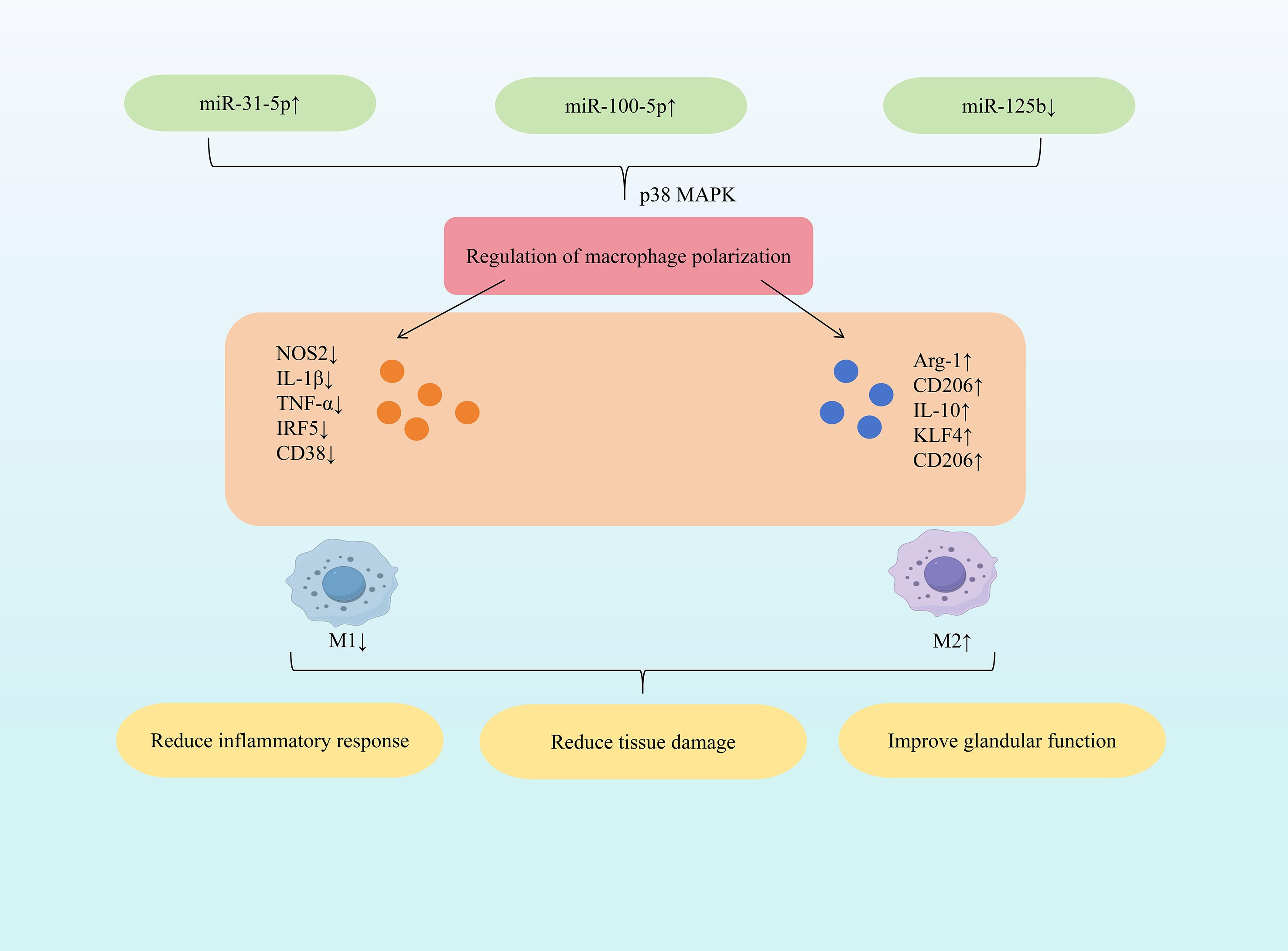 Research indicates that specific miRNAs (e.g., increased miR-31-5p, miR-100-5p; decreased miR-125b) can regulate macrophage cytokine and marker expression. This promotes polarization towards the anti-inflammatory M2 phenotype, dampens inflammatory responses, and modulates Th17/Treg balance, ultimately exerting protective effects against SjD. Among all the modifications, N6-methyladenosine (m6A) is the one that has been most extensively studied and is the most commonly found internal chemical modification on mRNA and non-coding RNA (35). m6A is a key upstream regulatory factor in miRNA biogenesis, capable of modifying various components in the miRNA generation pathway. It regulates RNA transcription, translation and stability, thereby widely influencing the level and function of miRNA (36). Dysregulation of m6A regulatory factors is implicated in the pathogenesis of Sjögren’s syndrome (SS) (37, 38). Study demonstrated that increased expression of m6A-modified miR-31-5p directly targets the P2X7 receptor, downregulating p38 MAPK expression and inhibiting the p38 MAPK signaling pathway. This cascade reduces NOS2, IL-1β, and TNF-α expression while increasing Arg-1, CD206, and IL-10 expression. Consequently, M1 macrophage activation is suppressed, M2 macrophage activation is promoted, restoring the M1/M2 balance. This shift alleviates inflammatory cell infiltration and tissue damage, thereby reducing dry eye symptoms (39). Mesenchymal stem cells (MSCs), pluripotent stem cells isolated from bone marrow and other tissues, primarily promote regeneration and modulate immune responses via paracrine mechanisms (40). Extracellular vesicles (EVs) derived from early-passage induced MSCs (iMSCs) effectively inhibited salivary gland inflammation onset in SS mouse models, with efficiency comparable to EVs from young iMSCs and bone marrow MSCs (41). Further research demonstrated that inhibiting miR-125b expression in senescence-associated iMSC-EVs reduced CD38 expression and increased CD206 expression, lowering the CD38/CD206 ratio and promoting M2 macrophage polarization. This intervention also reduced the expression of IL-17a and IL-21, inhibited the differentiation of Th17 cells, and prevented the occurrence of salivary gland inflammation (42). Mesenchymal stem cell-derived small extracellular vesicles (MSC-sEVs) exhibit potent immunomodulatory properties and have therapeutic potential for various autoimmune diseases (43). Specifically, miR-100-5p within human umbilical cord MSC-sEVs (hUC-MSC-sEVs) exerts significant anti-SS effects. Elevating miR-100-5p expression reduced NOS2 and IRF5 expression while increasing CD206, Arg-1, and KLF4 expression, promoting M2 macrophage polarization. Furthermore, it increased the proportion of CD4+Foxp3+Tregs and promoted Treg differentiation. These changes decreased TNF-α, IL-1β, and IL-6 expression, mitigating inflammation. Consequently, this approach alleviated dry eye disease severity and ameliorated inflammation in both the tear film and conjunctiva (44). (Figure 2 illustrates miRNA-mediated macrophage polarization mechanisms in SjD therapy).