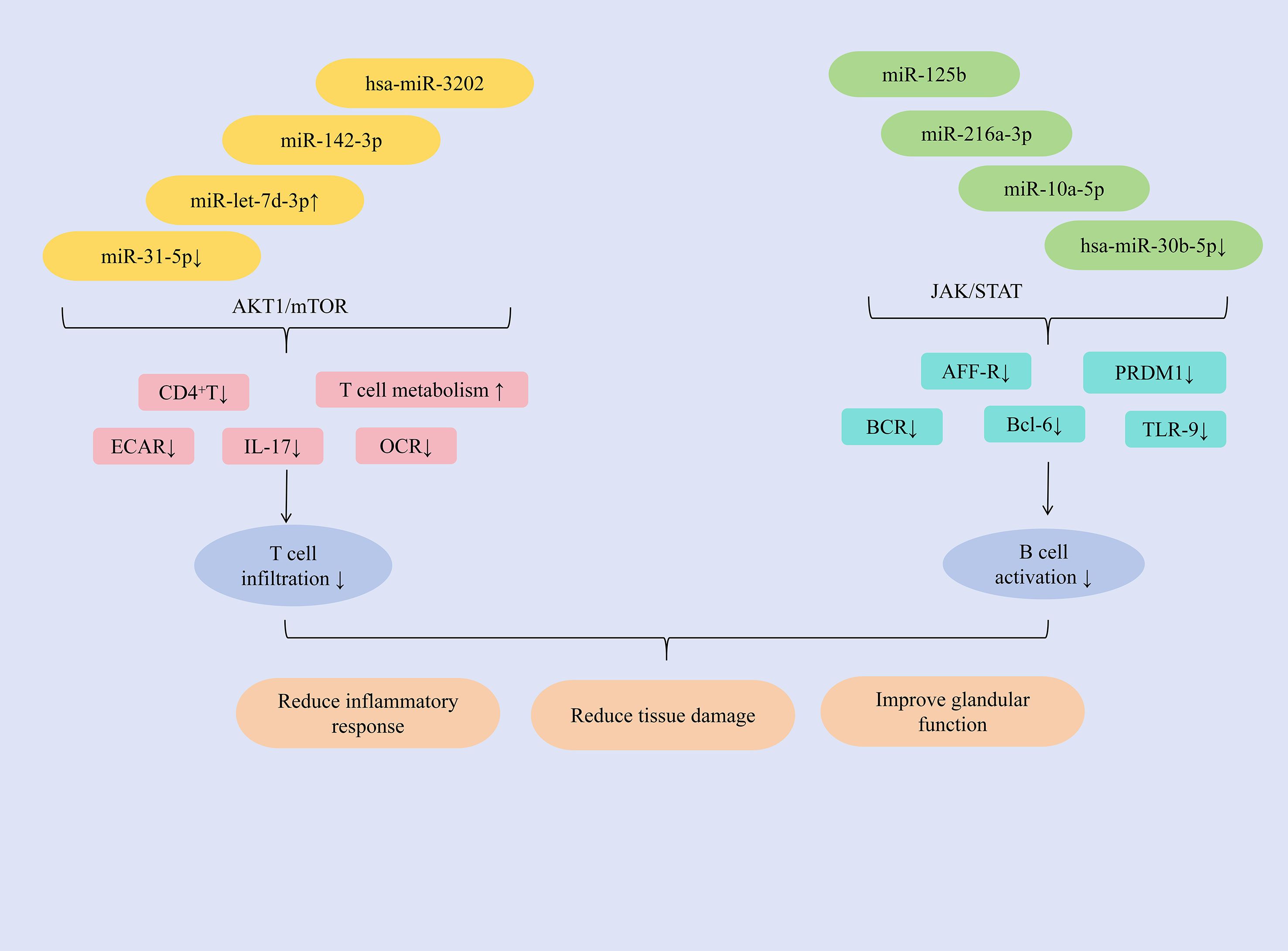 Studies have shown that hsa-miR-3202 can inhibit the proliferation and invasion of Jurkat cells, miR-142-3p promotes T cell activation, upregulation of miR-let-7d-3p expression can reduce the proportion of CD4+ T cells, and downregulation of miR-31-5p expression can promote glycolysis in CD4+ T cells, inducing an autoimmune T cell response, ultimately exerting an anti-SjD effect. MMP2 is highly expressed in PBMCs and salivary gland tissues of patients with SjD. The study found that hsa-miR-3202 can reduce the expression of MMP2 in Jurkat cells, inhibit T lymphocyte infiltration, improve immune inflammatory responses; and inhibit the proliferation and invasion of Jurkat cells, alleviate salivary gland tissue damage, improve gland function, and increase saliva secretion (89). T-cell exosome-derived miR-142-3p functions as a pathogenic driver of SS immunopathology. This miRNA exhibits predominant expression within immune compartments and critically regulates T-cell functionality (90, 91). Key predictive targets of miR-142-3p include adenylate cyclase 9 (AC9), sarcoplasmic reticulum Ca²+-ATPase 2b (SERCA2b), and ryanodine receptor 2 (RyR2)–all essential regulators of salivary gland secretion (92). miR-142-3p impairs salivary gland function through multiple mechanisms: restricting cAMP production, altering calcium signaling, and reducing acinar protein secretion. Concurrently, it promotes T-cell activation and directly disrupts epithelial cell function, collectively exacerbating glandular dysfunction in SS patients. Consequently, targeted reduction of miR-142-3p represents a promising therapeutic strategy for SS (93). The abnormal expression of IL-17 can run through the entire process of the occurrence and development of SjD and is regarded as an important target for anti-SjD treatment (94). The AKT1/mTOR signaling pathway regulates IL-17 function in a variety of autoimmune diseases (95). miR-let-7d-3p is regarded as the miRNA with the most significant inhibition in expression in patients with SjD (79). Research has found that in SjD patients, the expression of miR-let-7d-3p is negatively correlated with the expression of IL-17. Furthermore, upregulating miR-let-7d-3p expression could modulate the AKT1/mTOR signaling pathway, regulate the proportion of CD4+ T cells, reduce IL-17 expression, and alleviate inflammation (96). Previous study has shown that the decreased level of miR-31-5p in CD3+T cells of SS patients was closely related to the decreased level of miR-31-5p in CD3+T cells of SLE patients (97). Further research has found that by inhibiting the expression of miR-31-5p, the expression of basal extracellular acidification rate (ECAR) and oxygen consumption rate (OCR) of CD4+T cells could be reduced, and the OCR/ECAR ratio could be regulated, the glycolytic process could be promoted, the basal level of glucose metabolism could be increased, and ultimately the autoimmune T cell response could be promoted (98).