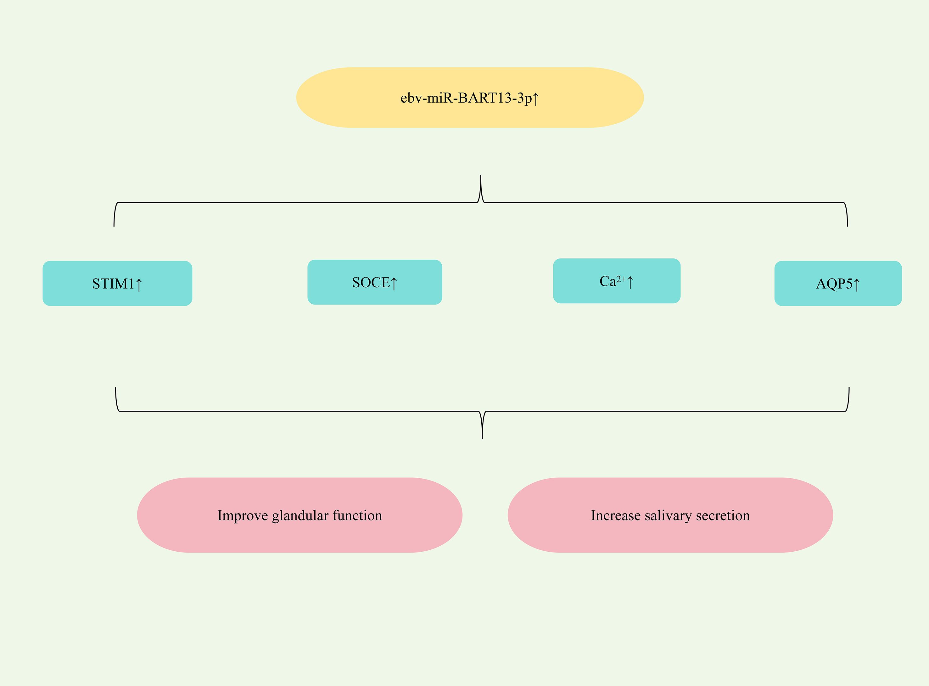 All patients with SjD experience glandular dysfunction. This dysfunction arises, in part, from abnormal acinar cell function, which can impair duct cell activation and disrupt progenitor cell homeostasis, ultimately contributing to salivary gland impairment (105). Furthermore, Epstein-Barr virus (EBV) exploits exosomes to transfer its miRNAs from infected B lymphocytes to non-B lymphocytes, promoting salivary dysfunction in SjD (106). Significantly elevated levels of the EBV-specific miRNA ebv-miR-BART13-3p are detected in the salivary glands (SG) of SjD patients (107). Study has found that ebv-miR-BART13-3p could down-regulate the expression of matrix-interacting molecule 1 (STIM1), damage calcium reservoir manipulated calcium entry (SOCE), reduce the expression of Ca2+ -dependent genes regulated by SOCE, and thereby impair SG function. It could also down-regulate the expression of AQP5, damage glandular function and reduce saliva secretion (108). Therefore, targeting the upregulation of ebv-miR-BART13-3p represents a potential therapeutic strategy for alleviating dry mouth symptoms in SS patients. (Figure 6 shows miRNA-mediated restoration of glandular function for SjD therapy).
