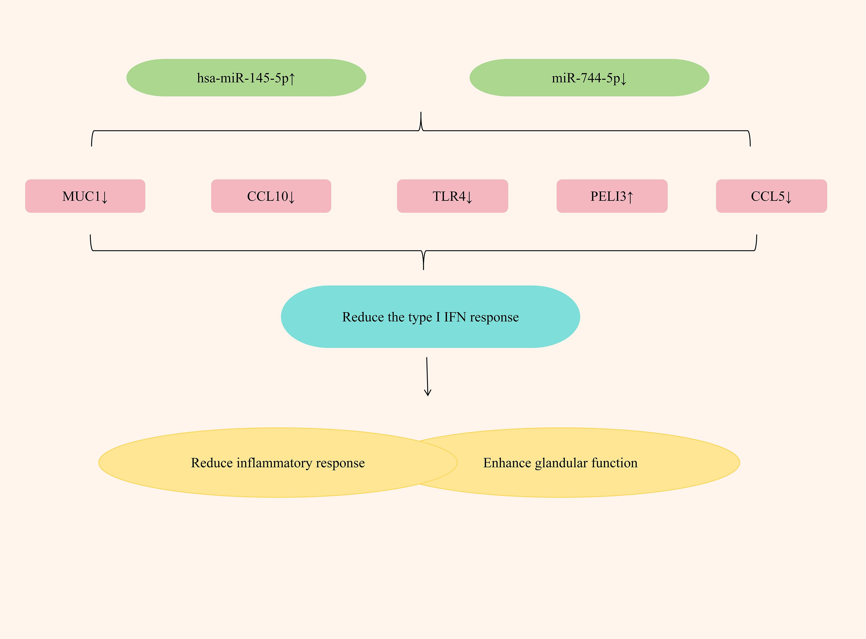 Studies have found that by up-regulating the expression of hsa-miR-145-5p and down-regulating the expression of miR-744-5p, the type I IFN response can be significantly alleviated, exerting an anti-SjD effect. Hsa-miR-145-5p, an anti-inflammatory miRNA, is significantly downregulated in the salivary glands (SG) of SjD patients. This suppression is mediated by type I interferon (IFN), which reduces its expression level (114). Mucin 1 (MUC1) and Toll-like receptor 4 (TLR4) are two related targets of hsa-miR-145-5p. The research has found that in patients with Sjögren’s disease (SjD), by inhibiting the expression of hsa-miR-145-5p, the expressions of MUC1 and TLR4 can be increased, thereby causing salivary gland inflammation and gland dysfunction; if the expression of hsa-miR-145-5p is upregulated, the expressions of MUC1, TLR4 and type I interferons can be reduced, significantly alleviating the inflammatory response, enhancing gland function, and improving dryness symptoms (115). PELI3, a member of the Pellino E3 ubiquitin ligase family, is a recognized negative regulator of inflammation that functions through its interaction with Toll-like receptors (TLRs) (116). In patients with SjD, the expression of miR-744-5p significantly increased, while the expression of PELI3 significantly decreased (48). Further research has found that by down-regulating the expression of miR-744-5p, the expression of PELI3 could be increased, the expression of IFN-dependent chemokines Rantes (CCL5) and CXCL10 could be reduced, the inflammatory response could be significantly alleviated, and the dry eye symptoms of SS patients could be improved (117). (Figure 7 elucidates miRNA regulation of type I interferon responses in SjD treatment).