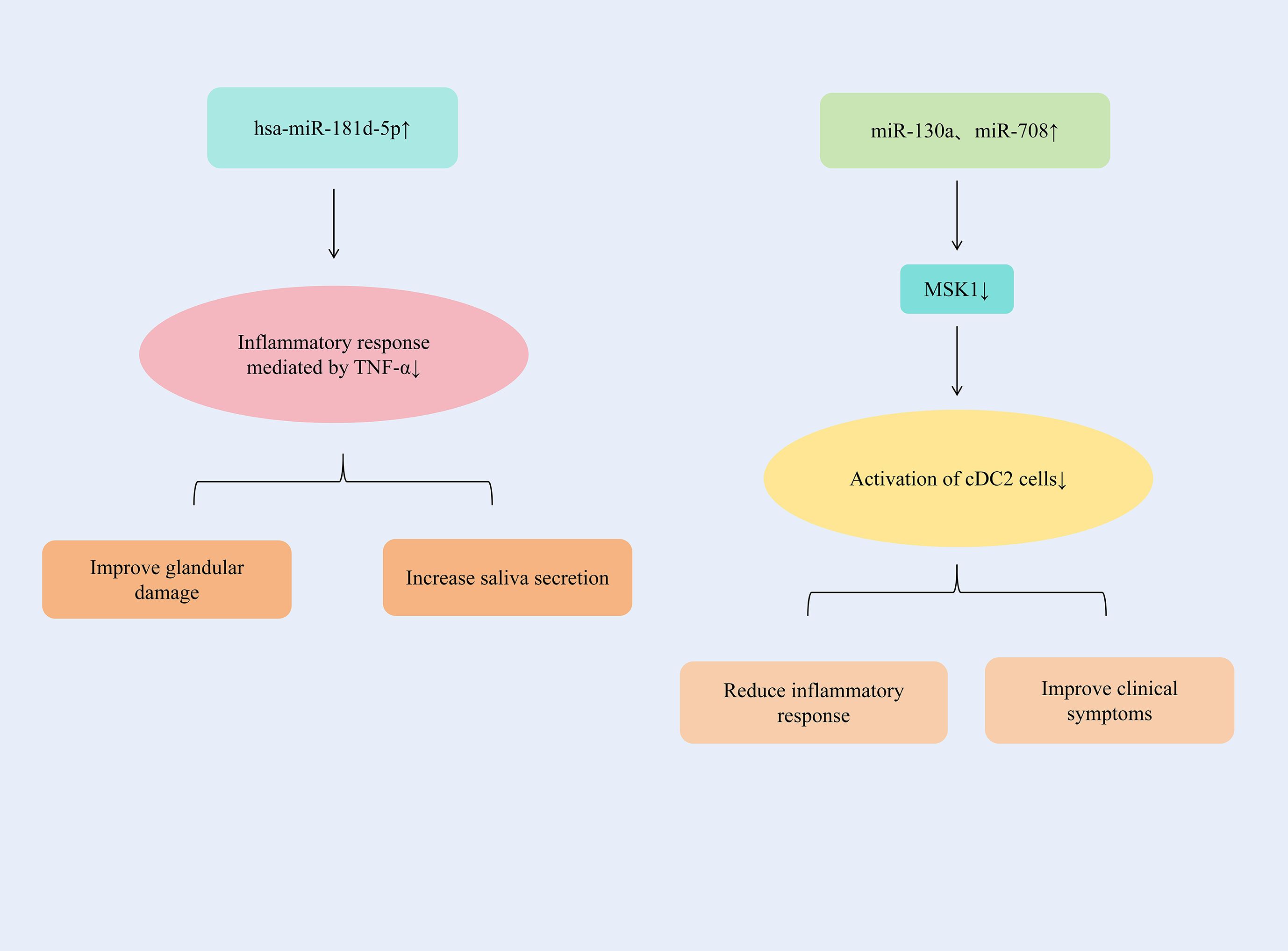 By up-regulating the expression of hsa-miR-181d-5p, the inflammatory response mediated by TNF-α could be significantly alleviated. The up-regulation of miR-130a and miR-708 expression could inhibit the activation of cDC2 cells and alleviate the inflammatory response of SjD.