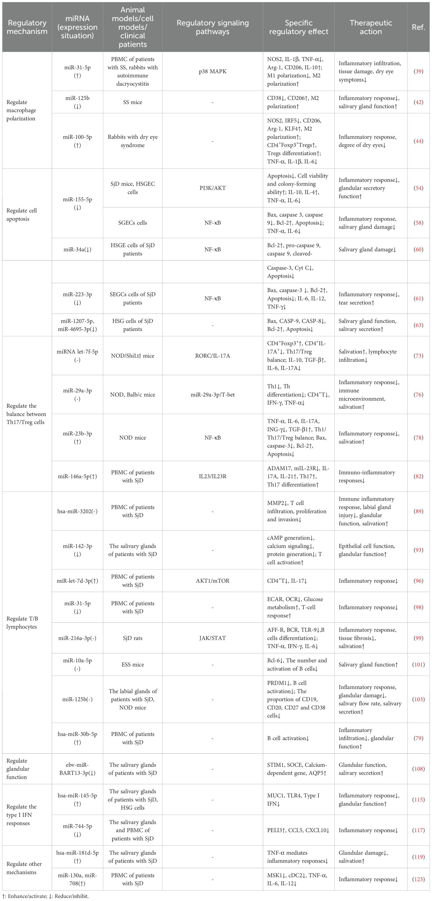 Summary and analysis are as follows: 1) signaling pathways: miRNAs predominantly modulate the NF-κB, JAK/STAT, and PI3K/AKT pathways. For example, downregulation of miR-155-5p, miR-223-3p, and miR-34a, or upregulation of miR-23b-3p, inhibits NF-κB signaling; 2) mechanistic targets: key regulatory functions include macrophage polarization, apoptosis, Th17/Treg balance, T/B lymphocyte activity, glandular function, and type I interferon (IFN) responses; 3) expression dynamics: most studies report directional miRNA alterations (up-/down-regulation). Apoptosis is typically regulated through miRNA downregulation, while macrophage polarization, T/B lymphocytes, and type I IFN responses exhibit bidirectional miRNA regulation. However, some studies lack explicit directionality; 4) research models: clinical therapeutic potential is demonstrated for miRNAs like miR-223-3p and miR-125b, while other evidence derives from in vivo (NOD mice) or in vitro (e.g., SGECs) models; 5) Certain miRNAs exhibit multi-mechanistic regulatory roles in SjD pathogenesis. For instance: miR-125b modulated macrophage polarization and promotes Th17 activation; miR-100-5p regulated macrophage polarization while enhancing Treg activation; miR-23b-3p balanced Th17/Treg ratios and inhibits apoptosis. Notably, individual miRNAs could target distinct signaling pathways. For example, down-regulation of miR-155-5p can inhibit apoptosis by regulating the PI3K/AKT and NF-κB signaling pathways respectively.