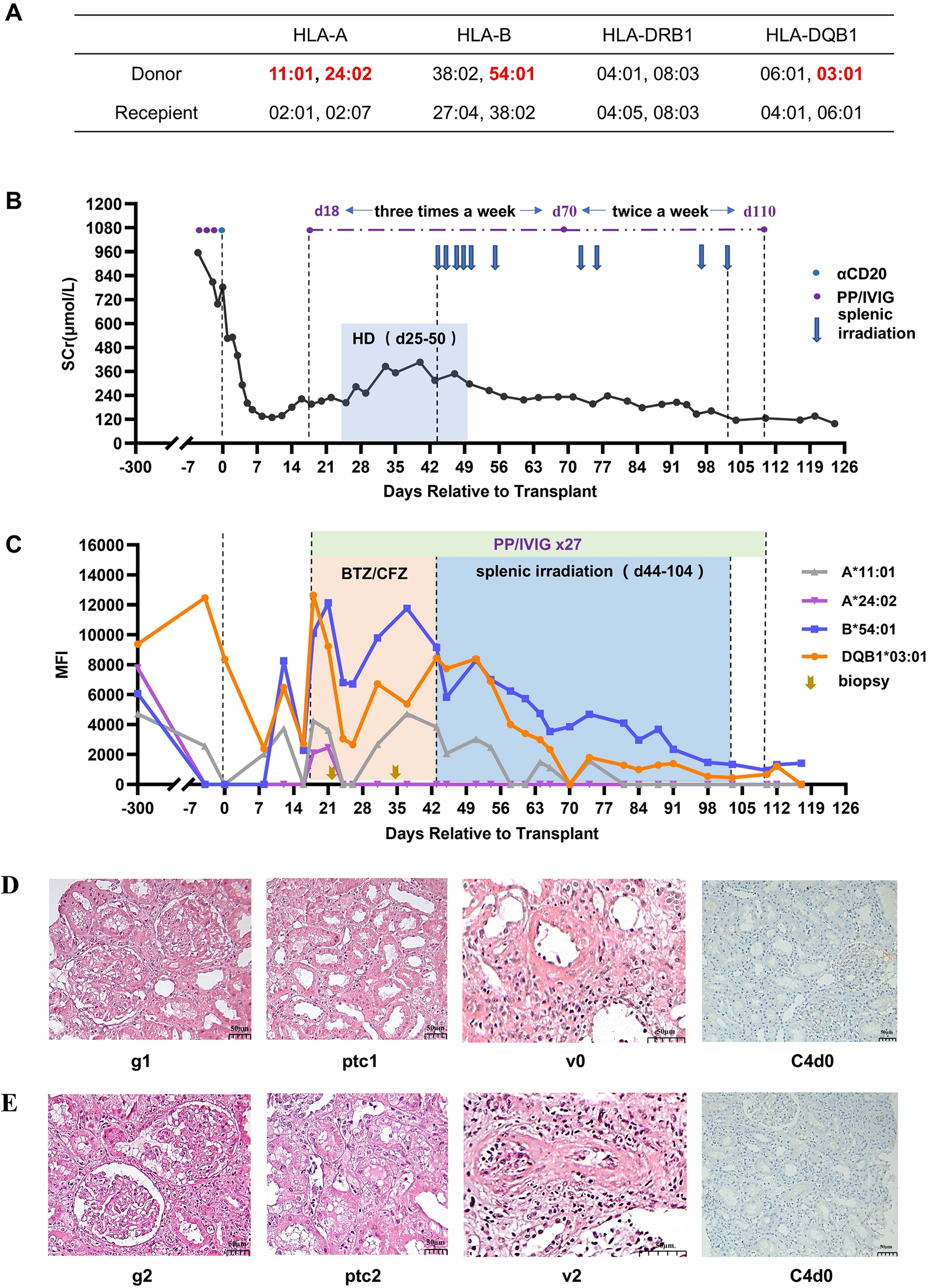 Treatment process and pathological results for Case 1. (A) HLA genotype results for the recipient and donor. (B) Changes in serum creatinine. (C) Changes in MFI values of DSAs. (D) Histopathological findings on day 22 and their Banff 2017 scores. (E) Histopathological findings on day 32. Hemodialysis (HD), bortezomib (BTZ), carfilzomib (CFZ), glomerulitis (g), peritubular capillaritis (ptc), intimal arteritis (v).