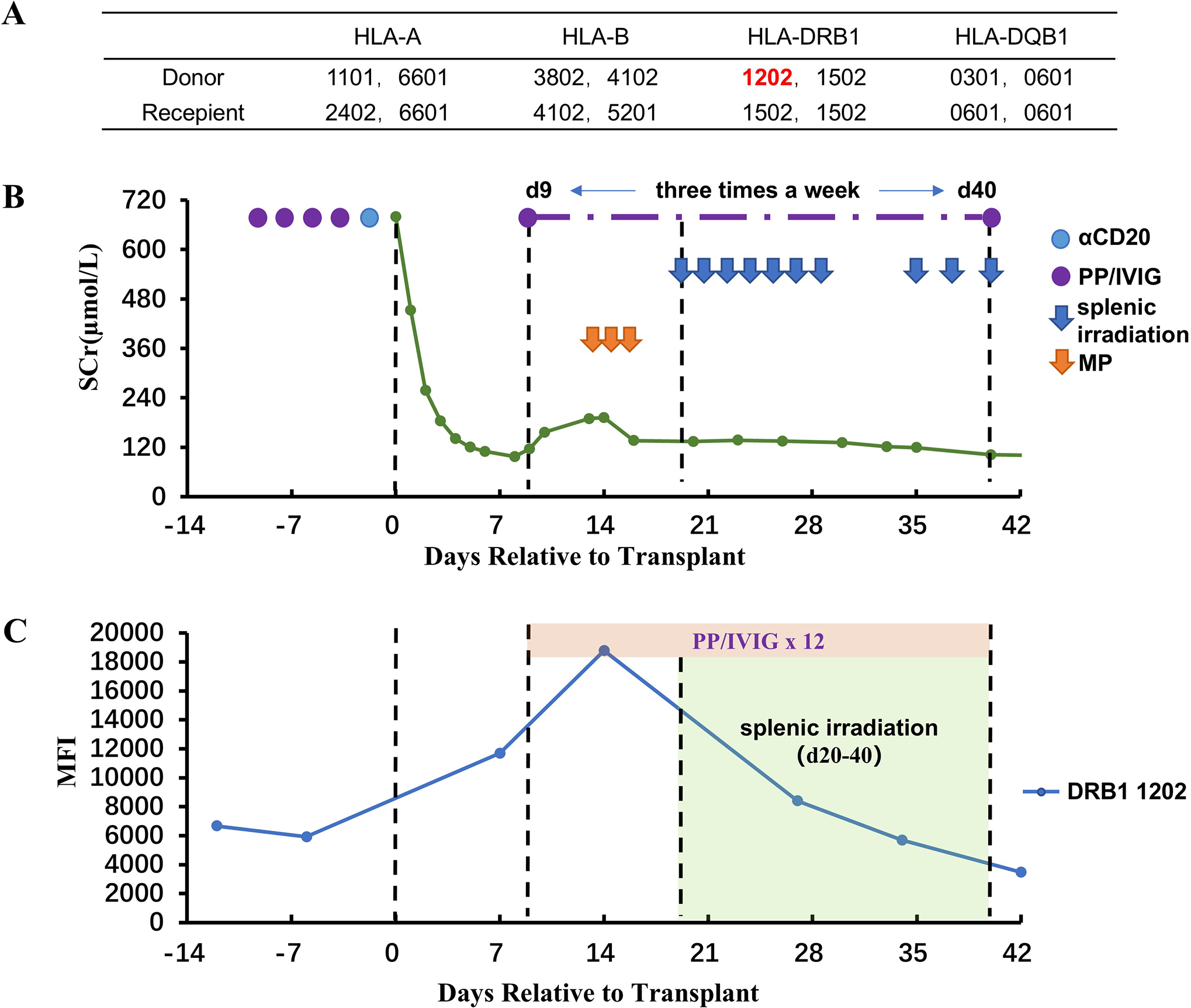 The patient is a 37-year-old female with blood type B. In 2013, her first kidney transplant was performed at another hospital in response to uremia caused by membranoproliferative glomerulonephritis. In 2015, because of the recurrence of the primary disease, the renal graft lost function, and hemodialysis was resumed. The graft was removed at the transplant hospital, and then all immunosuppressants were discontinued. Eight years later (in 2023), the patient registered for a second kidney transplantation in our hospital. The cPRA result showed high sensitization: 94% for HLA-I and 91% for HLA-II. While the patient was waiting for kidney transplantation, oral immunosuppressants were resumed: The tacrolimus trough level was maintained at 5–7 ng/ml, and MMF was given at a dose of 0.5 g, q12 hr.