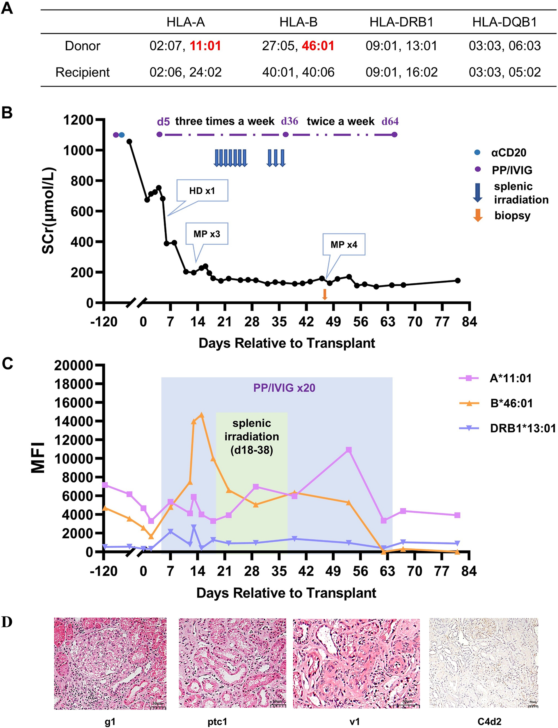 Treatment process and pathological results for Case 3. (A) HLA genotype results for the patient and donor. (B) Changes in serum creatinine. (C) Changes in MFI values of DSAs. (D) Histopathological features of the renal allograft on day 48 and their Banff 2019 scores. Hemodialysis (HD), methylprednisolone (MP), glomerulitis (g), peritubular capillaritis (ptc), intimal arteritis (v).