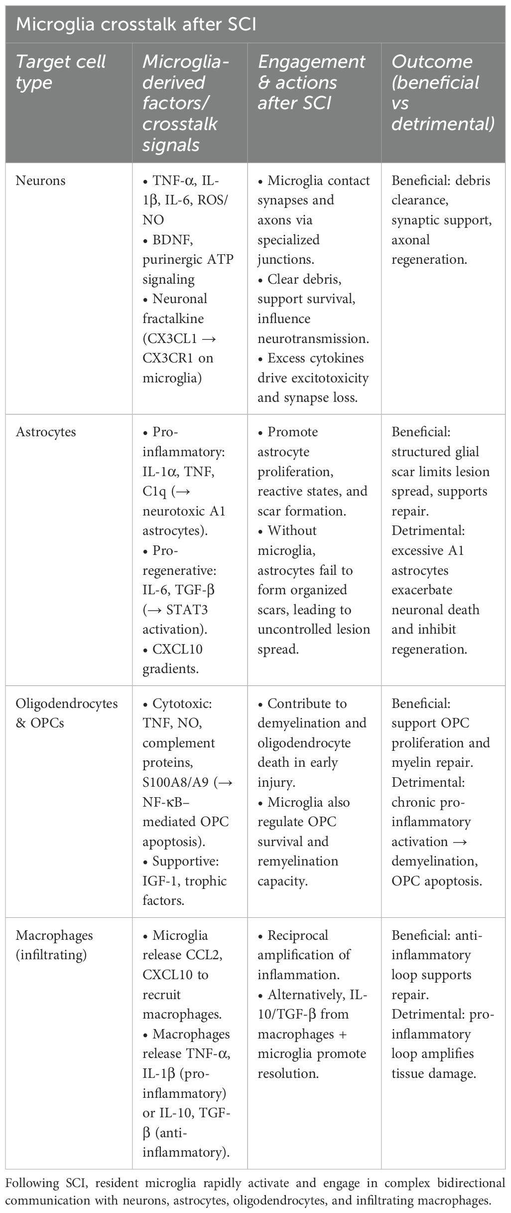 Following SCI, resident microglia rapidly emerge as key regulators of the neuroinflammatory response. Unlike infiltrating macrophages, microglia are intrinsic to the CNS and respond within hours of injury. They engage directly with damaged neurons, axons, and surrounding glial cells, positioning them at the forefront of the injury response (8, 49, 50).