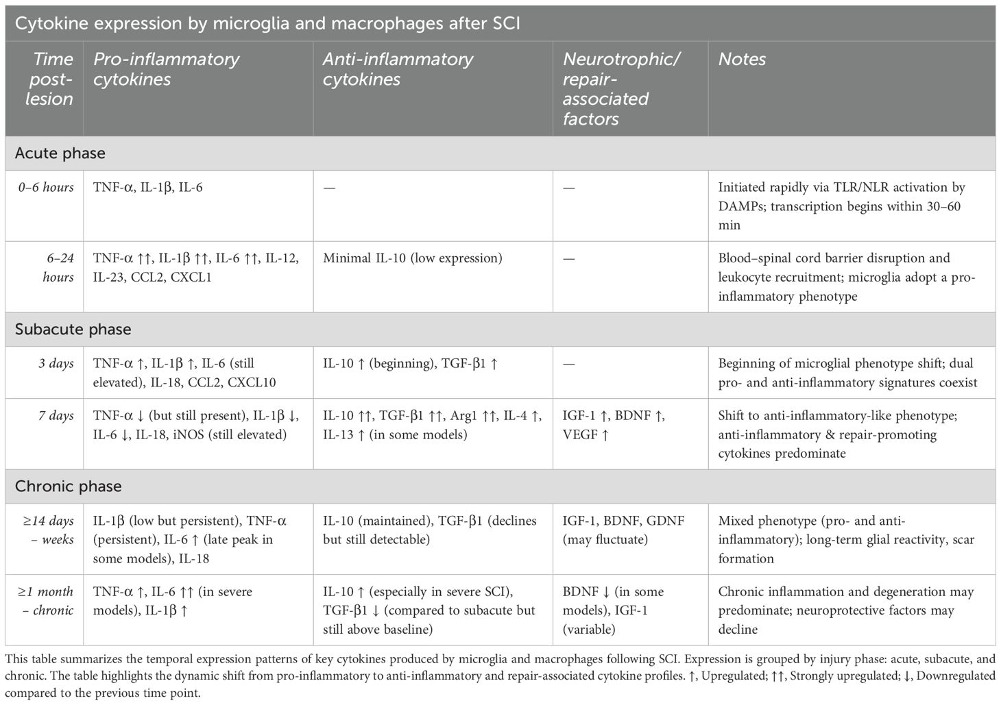 In the temporal progression, immediately after SCI, the microenvironment is dominated by acute injury signals such as necrotic cells, free radicals, and pro-inflammatory cytokines. Within the first 24 hours post-injury, microglia adopt a predominantly pro-inflammatory phenotype, characterized by peak expression of TNF-α, IL-1β, and IL-6 (43, 63, 64). These cytokines amplify the inflammatory milieu and contribute to blood-spinal cord barrier disruption, leukocyte recruitment, and secondary injury (Table 1) (43).