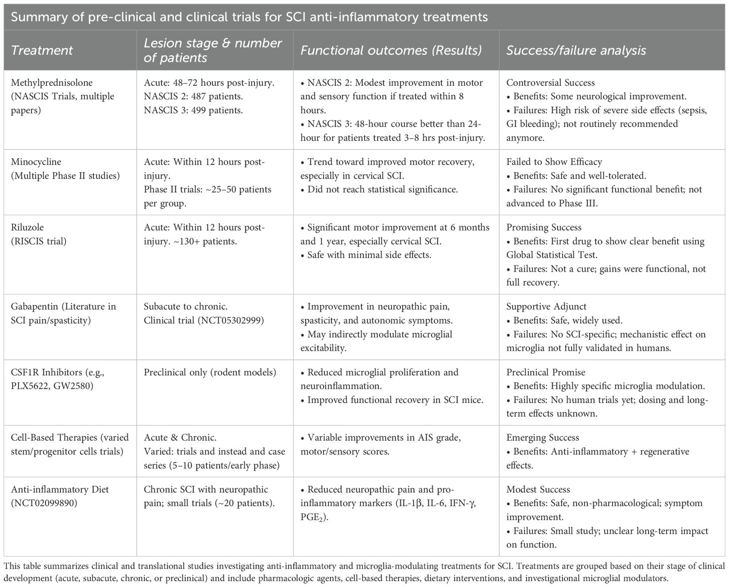 Despite the promise of microglia-targeted therapies for spinal cord injury (SCI), translating preclinical success into effective clinical interventions remains a significant challenge. Numerous preclinical and clinical trials have focused on modulating the inflammatory cascade after SCI, using approaches such as immune-modulating drugs, cell-based therapies, exosome-based strategies, and anti-inflammatory diets (Table 3). Findings from these studies highlight key translational barriers and suggest directions for future development.