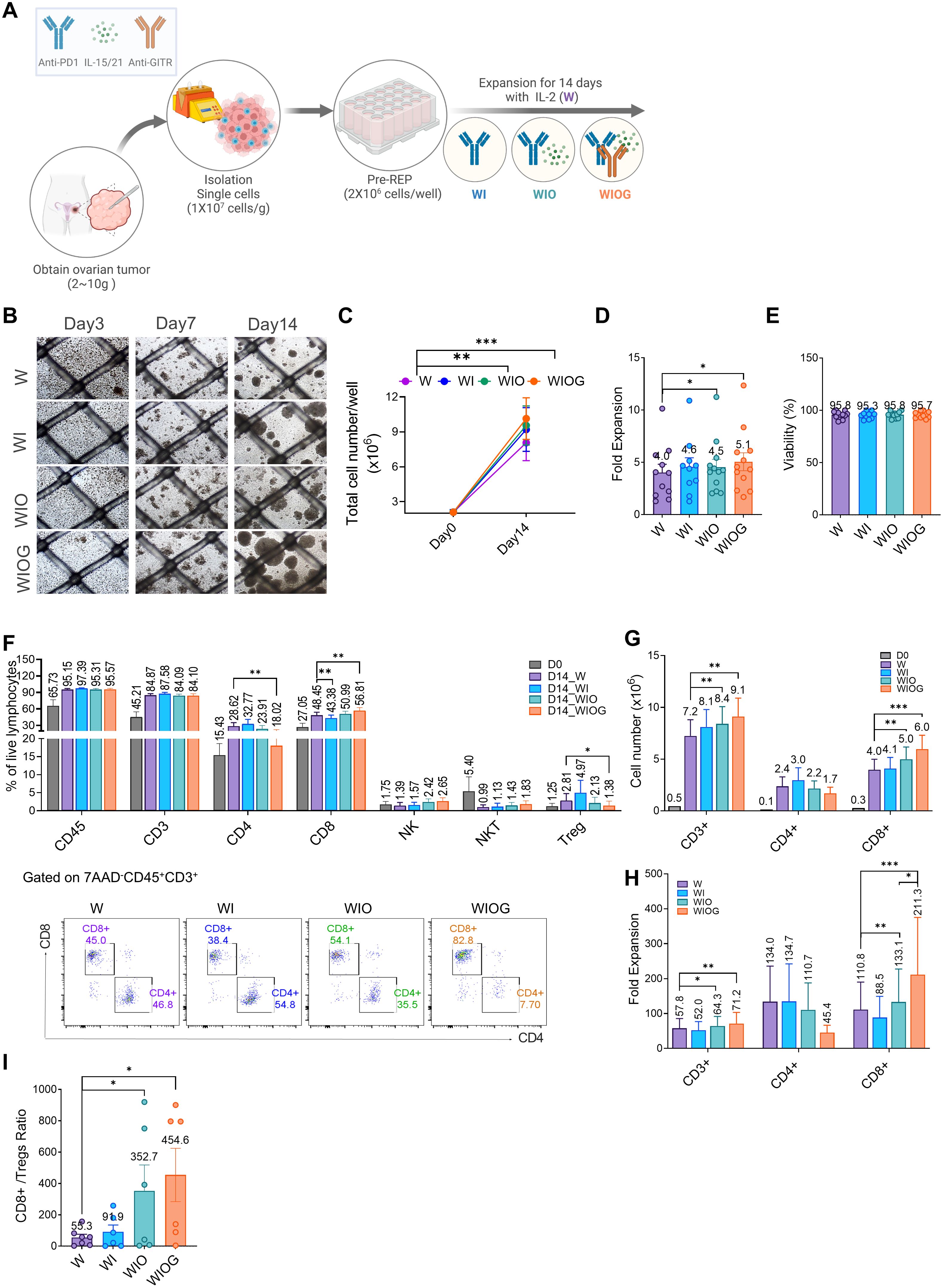 Figure 1. Anti-GITR increased CD8+ T cells and decreased Treg cells. (A) Schematic illustration of TIL expansion from ovarian cancer tissue. HGSC samples were obtained, dissociated into single-cell suspension, and expanded for 14 days with IL-2 under four different conditions: W (IL-2 alone), WI (IL-2 + Anti-PD1), WIO (IL-2 + Anti-PD1 + IL-15/21), and WIOG (IL-2 + Anti-PD1 + IL-15/21 + Anti-GITR). (B) Representative images of cell growth in each condition at days 3, 7, and 14. (C) Total cell number on days 0 and 14 under each condition. (D) Fold expansion of TILs expanded in each condition at day 14. (E) Viability of TILs at day 14 across different conditions. (F)Top: Percentages of CD45+, CD3+, CD4+ T cells, CD8+ T cells, NK cells, NKT cells, and Treg cells were analyzed using flow cytometry. Bottom: Representative plots of CD4+ and CD8+ T cells from each condition are shown after gating on 7AAD-CD45+CD3+ cells. The absolute cell numbers (G) and fold expansion (H) of CD3+, CD4+ and CD8+ T cells in each condition at day 14, as well as the ratio of CD8+/Tregs (I) were calculated. Data are presented as mean ± SD (n=10). Statistical analyses were performed using the Wilcoxon-test (*P < 0.05, **P < 0.01, ***P < 0.001).