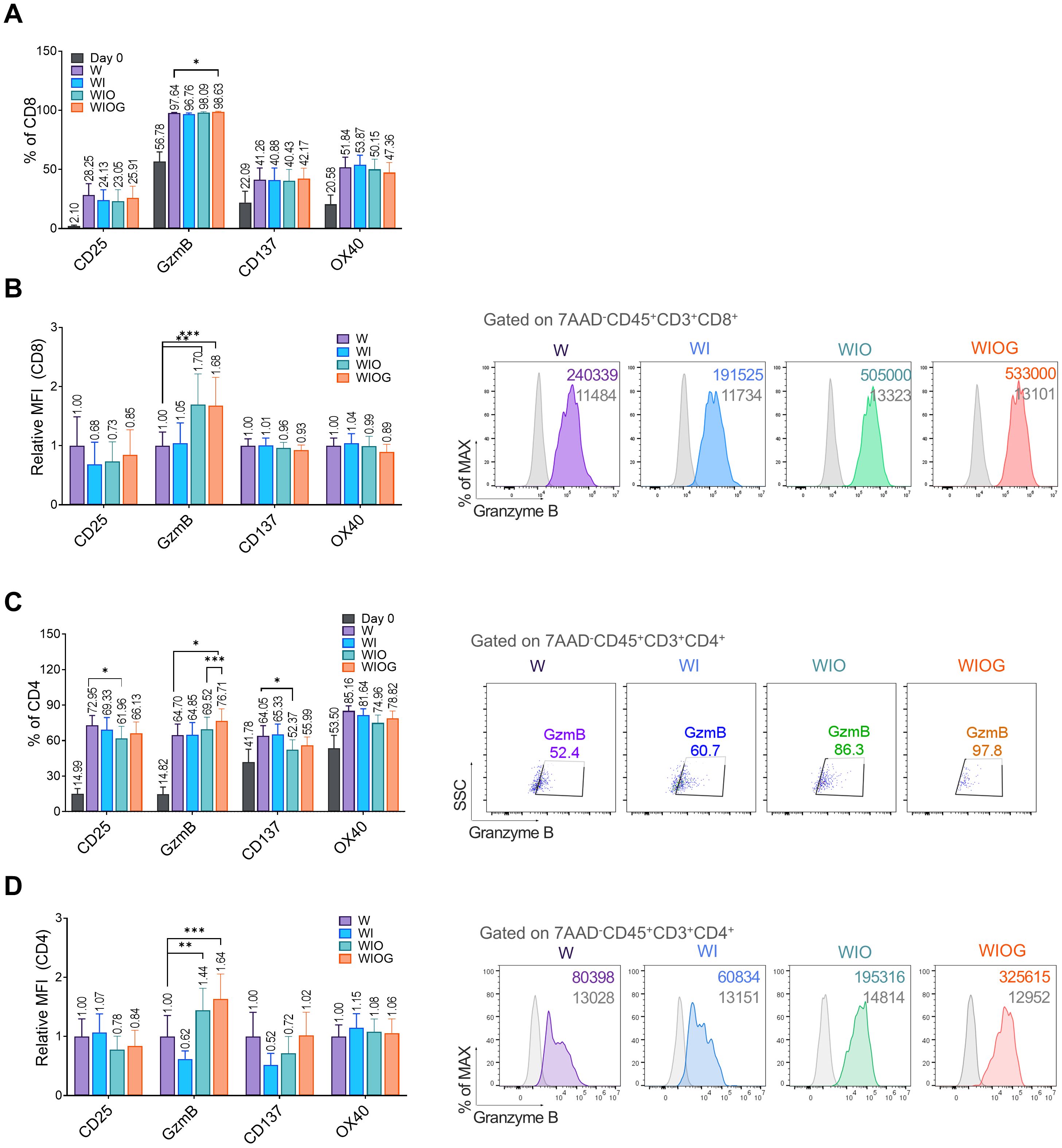 Figure 2. Phenotypic analysis of expanded TILs. (A) Percentages of CD8+ T cells expressing activation markers CD25, Granzyme B (GzmB), CD137, and OX40 under four different expansion conditions (W, WI, WIO, and WIOG) and at Day 0 (B) Left: Relative median fluorescence intensity (MFI) of activation markers on CD8+ T cells, measured by flow cytometry. Right: Representative histograms of GzmB expression in CD8+ T cells gated on 7AAD-CD45+CD3+CD8+ populations across the four conditions; grey histograms represent isotype controls. (C) Left: Percentage of CD4+ T cells expressing activation markers CD25, GzmB, CD137 and OX40 under four different expansion conditions. Right: Representative dot plots showing GzmB+ expression in CD4+ T cells gated on 7AAD-CD45+CD3+CD4+ populations under each condition. (D) Left: Relative MFI of activation markers on CD4+ T cells, determined by flow cytometry. Right: Representative histograms of GzmB expression in CD4+ T cells gated on 7AAD-CD45+CD3+CD4+ populations under the four conditions, with grey histograms indicating isotype controls. Data are presented as mean ± SD (n=10). Statistical analyses were performed using the Wilcoxon-test (*P < 0.05, **P < 0.01, ***P < 0.001).