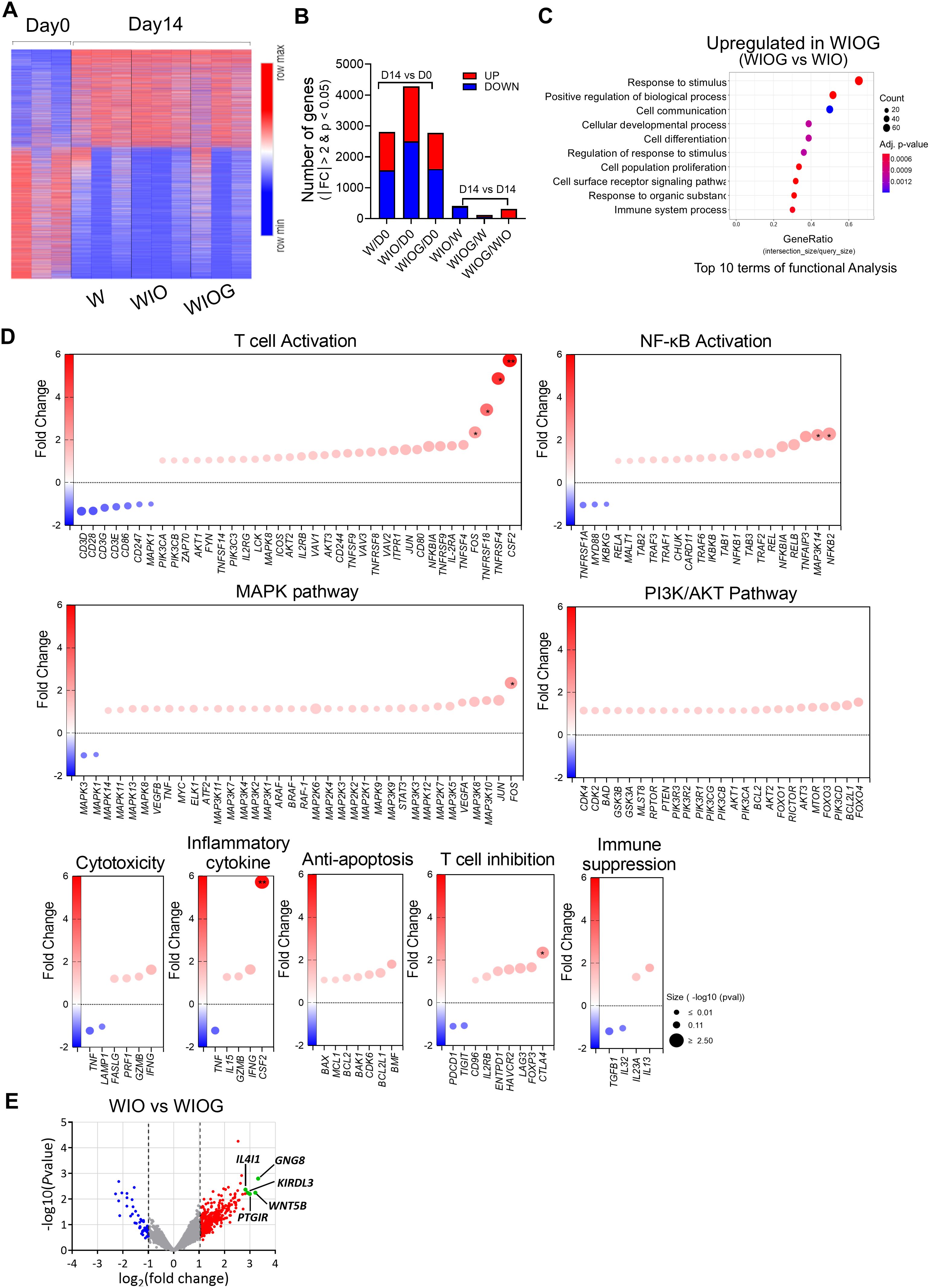 Figure 3. Gene expression signature of TILs after expansion. RNA was isolated from FACS-sorted CD8+ T cells from the W, WIO, and WIOG groups, followed by RNA sequencing, bioinformatics analysis, and differential gene expression (DEG) analysis. (A) The heatmap depicts the clustering of 4,975 differentially expressed genes on Day 14 compared to Day 0 (|fc|≥2 & raw. P < 0.05). Warm colors (red) indicate upregulated genes, whereas cool colors (blue) indicate downregulated genes relative to the average expression in Day 0 cells. (B) Number of total DEGs and the number of upregulated or downregulated genes identified between Day 14 and Day 0 in each condition, as well as between different treatment groups at Day 14. Red bars indicate upregulated genes, while blue bars indicate downregulated genes. (C) Gene Ontology Biological Process (GOBP) pathway analysis showing the top 10 pathways upregulated in Day14 WIOG compared to Day 14 WIO. (D) Dot plots representing fold changes in gene expression in the Day 14 WIOG group for genes associated with various biological pathways, including T cell activation, NF-κB activation, MAPK pathway, PI3K/AKT pathway, cytotoxicity, inflammatory cytokines, anti-apoptosis, T cell inhibition, and immune suppression. The x-axis indicates the fold change relative to Day 14 WIO. Genes with increased expression appear in warm colors (red), whereas decreased expression is shown in cool colors (blue). Dot size reflects the −log10 adjusted P value. (E) Volcano plot showing log2 fold changes and −log10 adjusted P values for gene expression differences between Day 14 WIOG and Day 14 WIO (|fold change| ≥ 2 and adjusted P < 0.05).
