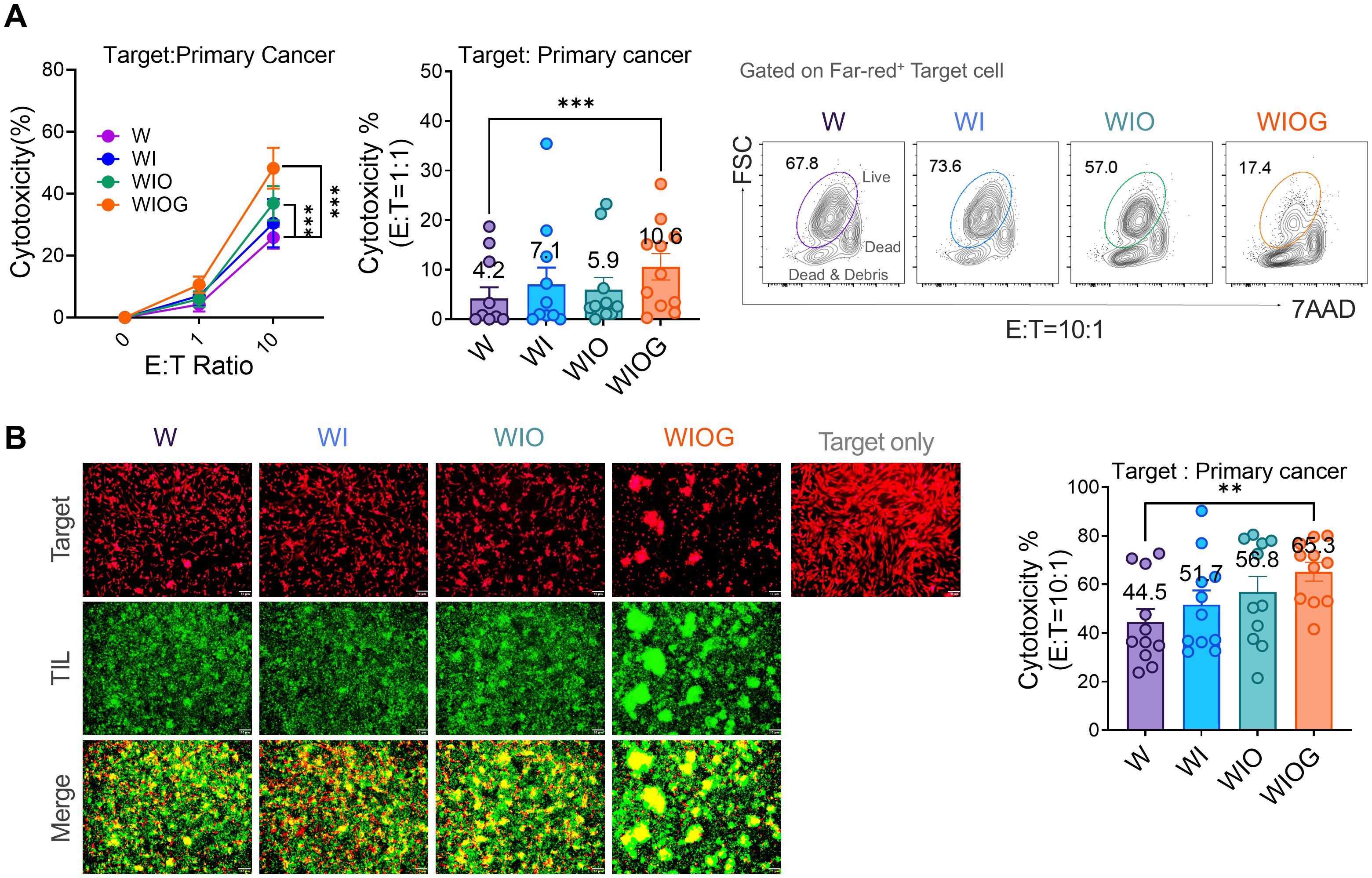 Figure 4. Cytotoxicity of expanded TILs against autologous primary cancer cells. (A) Left: Cytotoxic activity of TILs cultured under four different expansion conditions (W, WI, WIO, and WIOG) was assessed against autologous primary cancer cells using the Far Red/7-AAD flow cytometry assay at various effector-to-target (E:T) ratios. Middle: Bar graph showing the percentage of cytotoxicity at an E:T ratio of 1:1 for each condition. Right: Representative plot of 7AAD- Live cells (gated on the Far-red+ target cell population) under each expansion condition at an E:T ratio of 10:1. (B) Fluorescence microscopy analysis of TIL cytotoxicity against primary cancer cells. Left: Representative images of target cells labeled with Far Red (red) and expanded TILs labeled with Calcein (green) under four different expansion conditions, acquired at E:T ratio of 10:1. Bottom panels show merged images of target cells and TILs. Scale bar, 10 μm. Right: Quantification of TIL cytotoxicity against autologous primary cancer cells at an E:T ratio of 10:1. Data are presented as mean ± SD (n=10). Statistical analyses were performed using the Wilcoxon-test (**P < 0.01, ***P < 0.001).