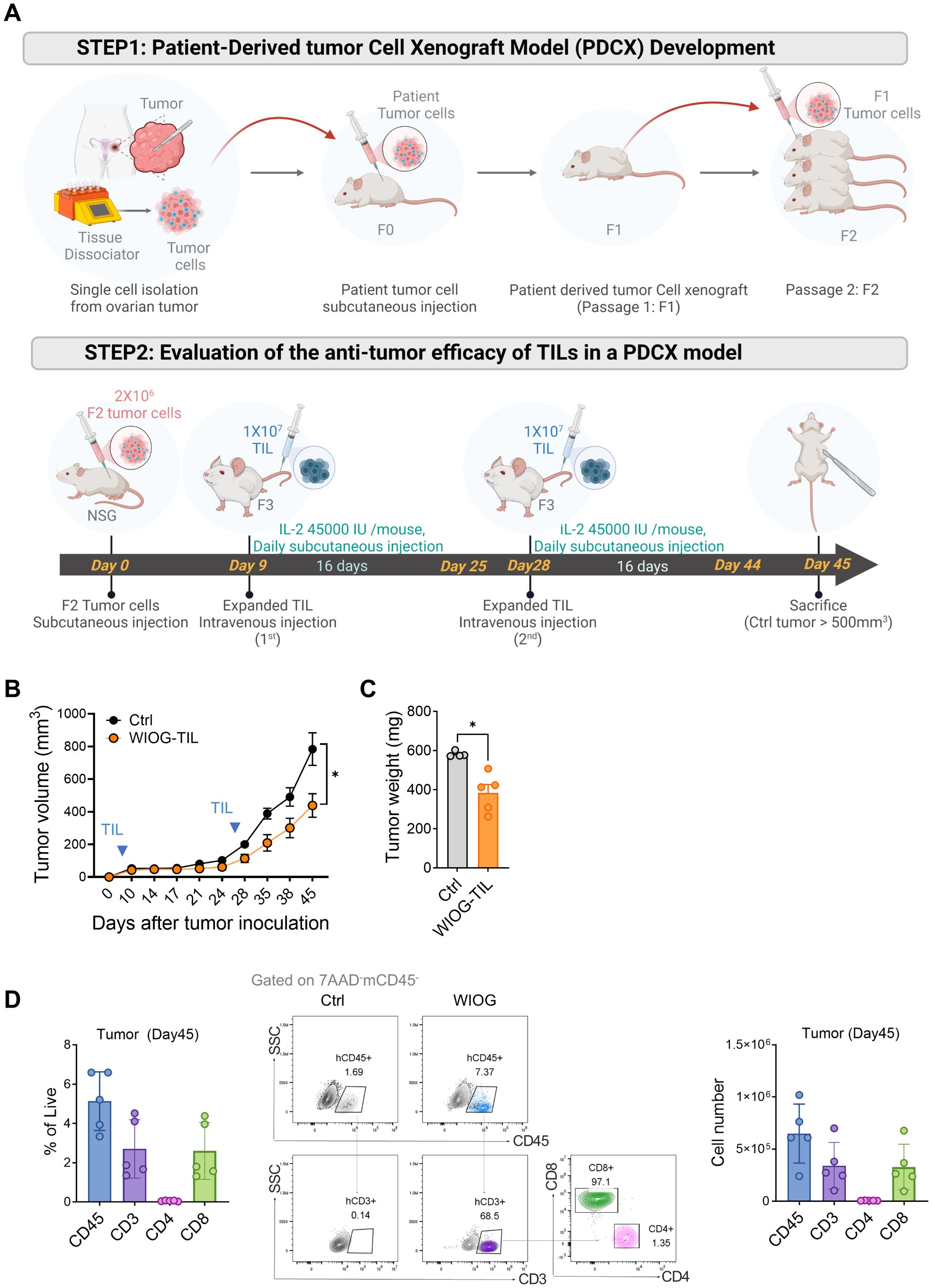 Figure 5. In vivo therapeutic effects of expanded TILs in the PDCX model. (A) Schematic illustration of the development and treatment protocol of the patient-derived tumor cell xenograft (PDCX) model. Upper panel: Ovarian tumor tissues were dissociated into single cells and subcutaneously injected into NSG mice to establish F0 tumors, which were serially passaged to generate F1 and F2 tumors. Lower panel: For therapeutic evaluation, F2 tumor cells were subcutaneously inoculated into NSG mice on Day 0. Expanded TILs (1 × 107) were administered intravenously on Day 9 and Day 28. IL-2 (45,000 IU/mouse) was injected subcutaneously daily for 16 days following each TIL infusion (n = 5 per each group). (B) Tumor volumes were measured at the indicated time points following tumor inoculation. (C) Tumor weights were measured at the time of sacrifice. Data are presented as mean ± SD (n = 5 per group). (D) TIL infiltration in tumors was assessed by flow cytometry on Day 45. Left: Percentages of human CD45+, CD3+, CD4+, and CD8+ T cells in tumor tissues. Middle: Representative dot plots showing human CD45+, CD3+, CD4+, and CD8+ T cells gated on 7AAD-mCD45- cells in tumors. Right: Absolute numbers of human CD45+, CD3+, CD4+, and CD8+ T cells in tumors from the WIOG-TIL group. Data are presented as mean ± SD (n=5). Statistical analyses were performed using the Mann-Whitney test (*P < 0.05).