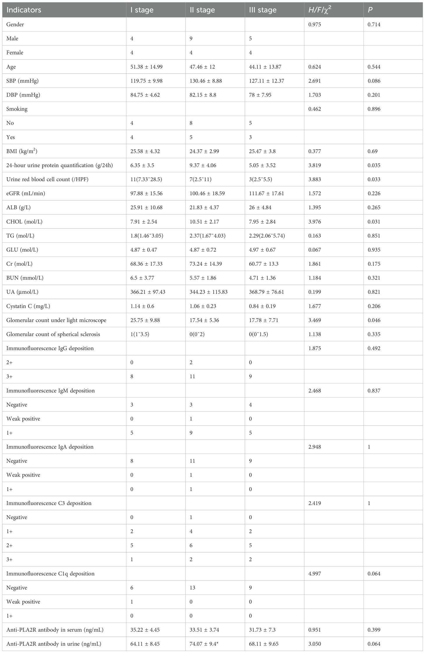 The hallmark pathological feature of IMN is the deposition of immune complexes under the epithelium of glomerular capillaries. These immune deposits, formed by specific antigens such as PLA2R and THSD7A binding to their respective antibodies, activate the complement system via the mannose-binding lectin pathway, leading to the formation of membrane attack complexes, podocyte injury, and subsequent proteinuria (12). Our results showed no significant difference in serum anti-PLA2R antibody levels across patients with stage I, II, and III disease based on the Ehrenreich-Churg classification. Similarly, while urinary anti-PLA2R antibody titers in stage II were higher than in stage I, no significant differences were observed between other groups. When grouping patients by median antibody titers for paired statistical analysis, we found no significant association between either serum or urinary anti-PLA2R antibody levels and pathological stage. This contrasts with previous studies that reported a gradient increase in serum anti-PLA2R antibodies across disease stages (13) or higher serum levels in stages II and III compared to stage I (14). These discrepancies may be attributed to several factors: (1) pathological staging relies on electron density as only one reference, alongside glomerular basement membrane and foot process changes; (2) there is often a weak correlation between serum anti-PLA2R antibody titers and glomerular PLA2R staining (r=0.03, P = 0.76) (15); and (3) other antigens beyond PLA2R, such as THSD7A, may contribute to immune complex formation in IMN (12).