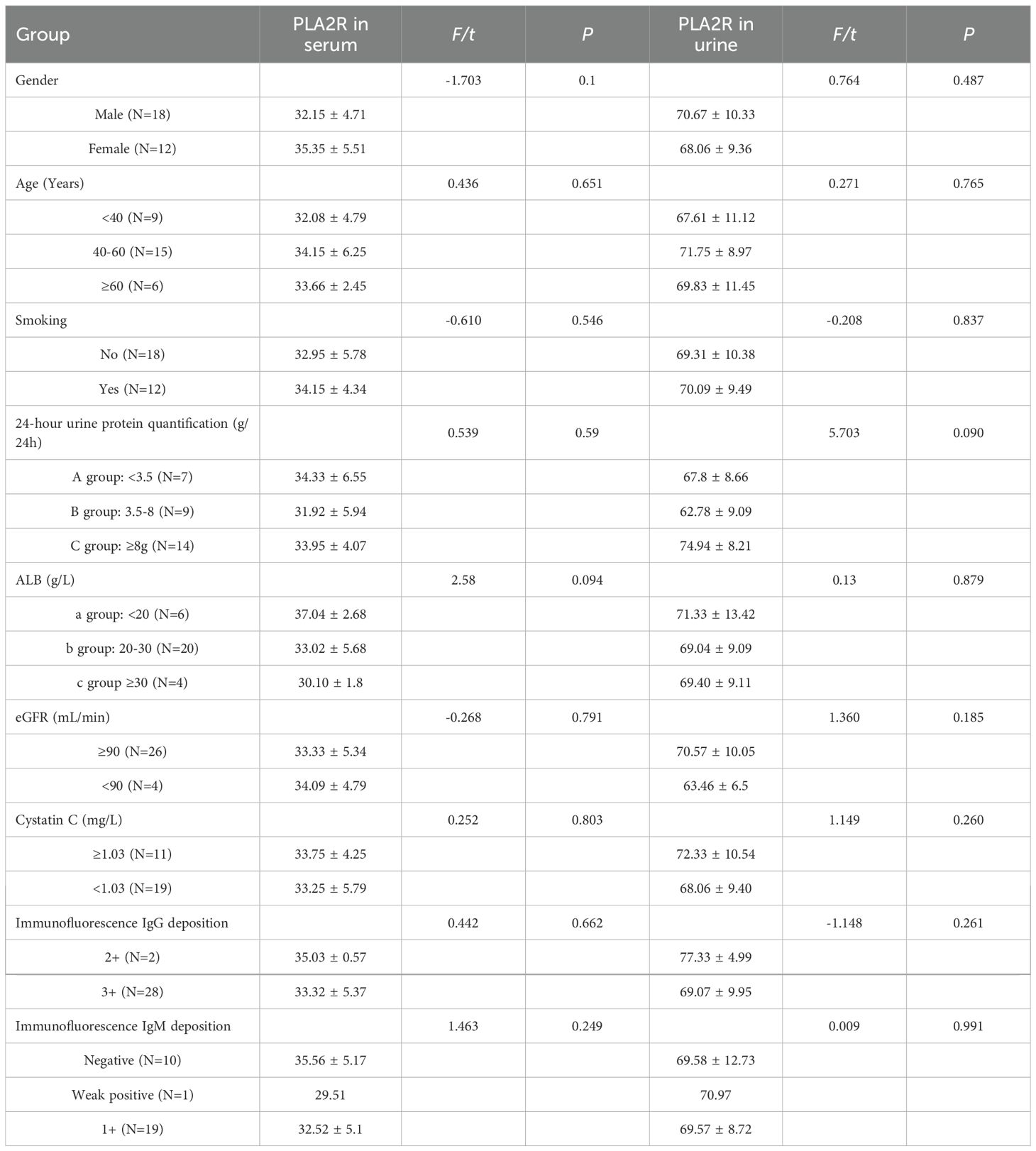 Table 3. Comparison of serum anti-PLA2R antibody and urine anti-PLA2R antibody expression levels in different groups.