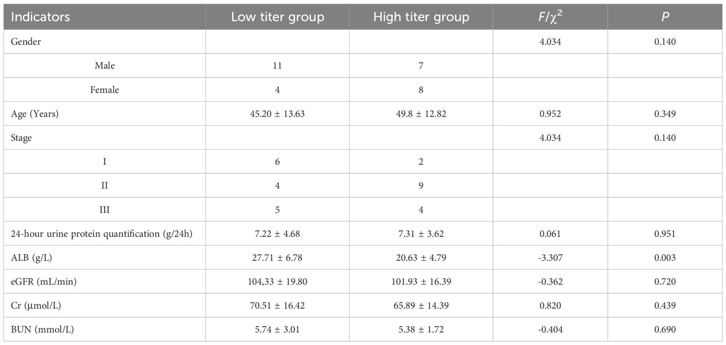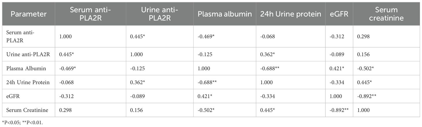 Results: Serum anti-PLA2R antibody levels showed a significant negative correlation with plasma albumin (r = -0.469, P < 0.05), whereas urine anti-PLA2R antibody levels exhibited a weak, but significant, positive correlation with 24-hour urine protein excretion (r = 0.362, P = 0.049). Patients with higher serum anti-PLA2R antibody titers had significantly lower plasma albumin levels (20.63 ± 4.79 g/L) compared to those with lower titers (27.71 ± 6.78 g/L) (P < 0.05). Conversely, patients with higher urine anti-PLA2R antibody titers had significantly higher 24-hour urine protein quantification (9.22 ± 4.17 g) compared to those with lower titers (5.32 ± 3.09 g) (P < 0.05).