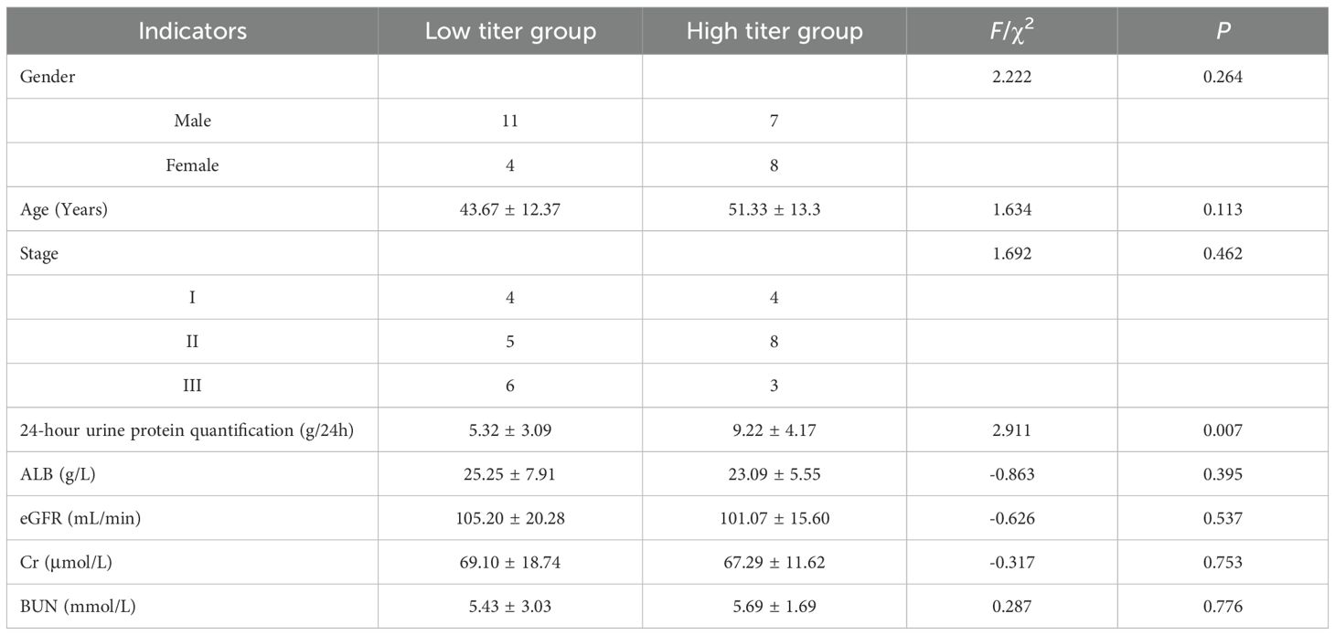 Table 4. The relationship between different titers of anti-PLA2R antibodies in serum and different indicators.