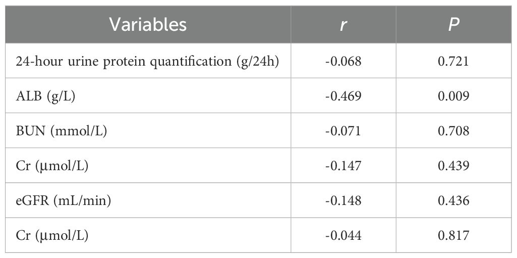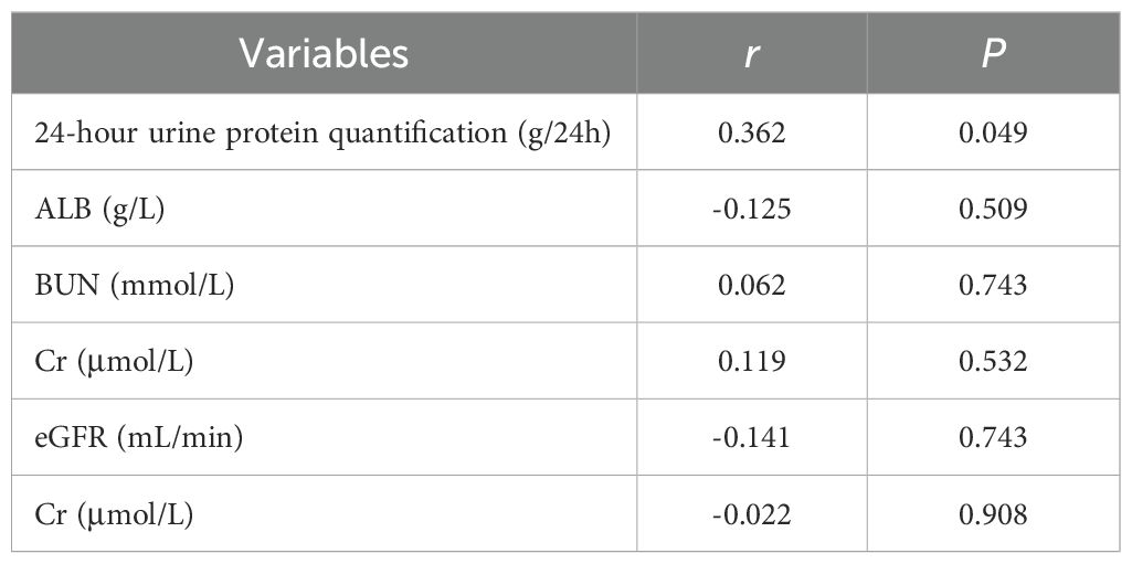 The correlations between anti-PLA2R antibody levels and key clinical parameters were systematically analyzed. For serum anti-PLA2R antibodies (Table 6), a significant negative correlation was observed with plasma albumin levels (r = -0.469, P = 0.009). However, no significant correlations were found between serum anti-PLA2R antibody levels and 24-hour urine protein quantification (r = -0.068, P = 0.721), blood urea nitrogen (BUN) (r = -0.071, P = 0.708), serum creatinine (Cr) (r = -0.147, P = 0.439), or estimated glomerular filtration rate (eGFR) (r = -0.148, P = 0.436). For urinary anti-PLA2R antibodies (Table 7), a significant positive correlation was observed with 24-hour urine protein quantification (r = 0.362, P = 0.049). In contrast, no significant correlations were found between urinary anti-PLA2R antibody levels and plasma albumin (ALB) (r = -0.125, P = 0.509), BUN (r = 0.062, P = 0.743), Cr (r = 0.119, P = 0.532), or eGFR (r = -0.141, P = 0.743).