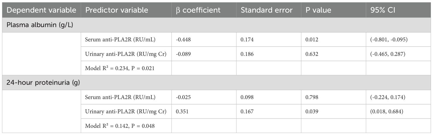 Multiple linear regression analysis (Table 9) was performed to assess the independent contributions of serum and urine anti-PLA2R antibodies to key clinical outcomes. When both markers were included in the model predicting plasma albumin levels, serum anti-PLA2R remained the dominant predictor (β=-0.448, P = 0.012), while urine anti-PLA2R showed minimal additional contribution (β=-0.089, P = 0.632). Conversely, for predicting 24-hour urine protein excretion, urine anti-PLA2R was the primary predictor (β=0.351, P = 0.039), with serum anti-PLA2R showing no significant association (β=-0.025, P = 0.798).