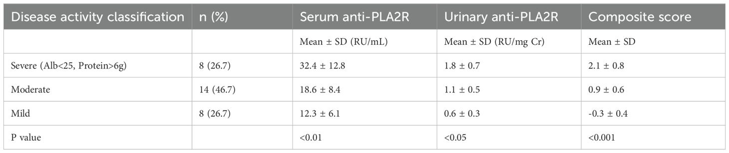 We classified patients into disease activity categories as shown in Table 10. Patients with severe disease activity (n=8, 26.7%) had significantly higher levels of both serum (32.4 ± 12.8 RU/mL) and urinary (1.8 ± 0.7 RU/mg Cr) anti-PLA2R antibodies compared to those with mild disease activity (P < 0.01 and P < 0.05, respectively). The composite disease activity score showed the strongest discrimination between groups (P < 0.001).