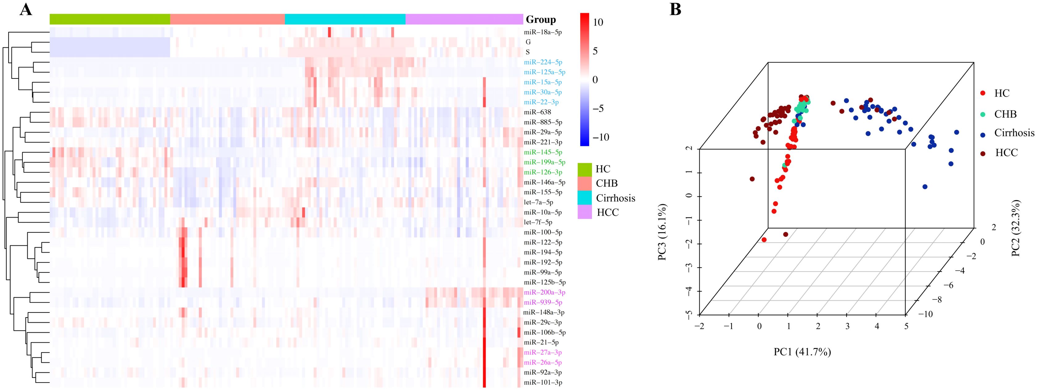 Figure 1. Unsupervised Clustering and Principal Component Analysis (PCA) of Plasma miRNA Expression Profiles across HC, CHB, Cirrhosis, and HCC Groups: (A) Heatmap with hierarchical clustering of 30 differentially expressed plasma miRNAs (rows) across all study samples (columns). Color intensity reflects relative expression levels (2-ΔCt), with red indicating upregulation and blue indicating downregulation. Samples are grouped by clinical status: healthy controls (HC, green), chronic hepatitis B (CHB, red), cirrhosis (cyan), and hepatocellular carcinoma (HCC, purple). Clustering reveals distinct expression patterns associated with disease progression. (B) Three-dimensional PCA plot based on the top 3 principal components (PC1: 41.7%, PC2: 32.3%, PC3: 16.1%), showing clear separation between HC, CHB, cirrhosis, and HCC groups. Each dot represents an individual sample, colored by group. The results demonstrate that global miRNA expression profiles can effectively distinguish disease stages, supporting their potential as molecular classifiers for liver disease progression. HC, Healthy control; CHB, chronic hepatitis B; Cirrhosis, HBV with cirrhosis patients; HCC, HBV with hepatocellular carcinoma patients.