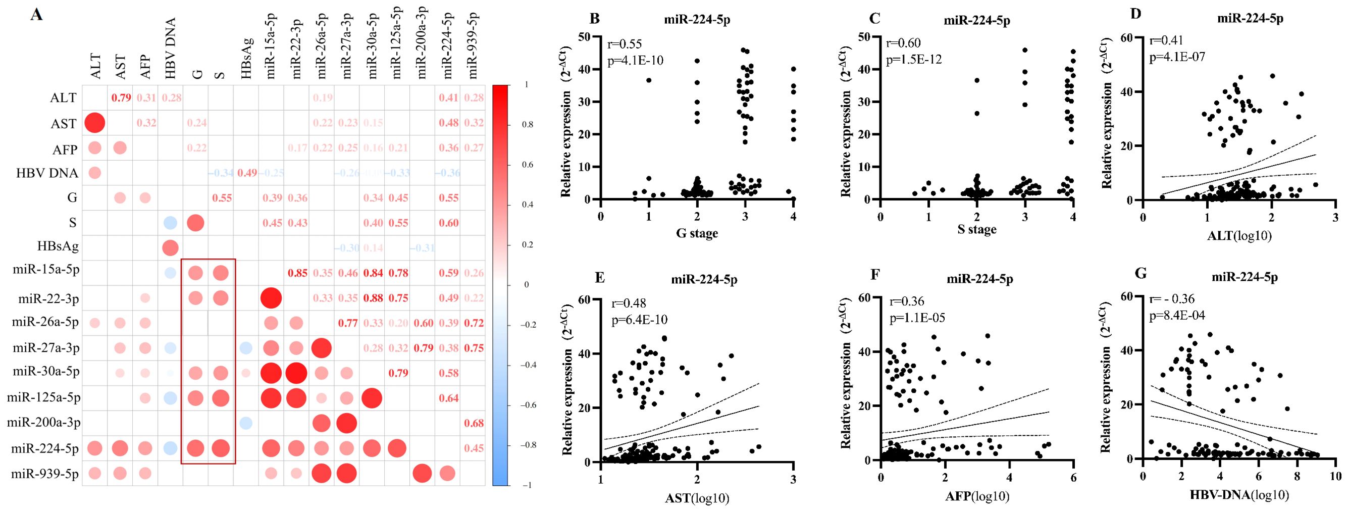 Figure 2. Correlation Analysis between miR-224-5p and Clinical Parameters in HBV-Infected Patients. (A) Correlation matrix analysis of highly expressed miRNAs with pathological grading of liver inflammation/fibrosis, key inflammation markers, and virological variables in cirrhosis and hepatocellular carcinoma cohorts. The significant differences in miR-224-5p were analyzed in conjunction with clinical and Enrichment analysis: (B, C) The analysis results of the correlation between miR-224-5p and G/S staging; (D–G) Correlation analysis of relative miR-224-5p expression levels with clinical indicators in a cohort of HBV-infected patients.