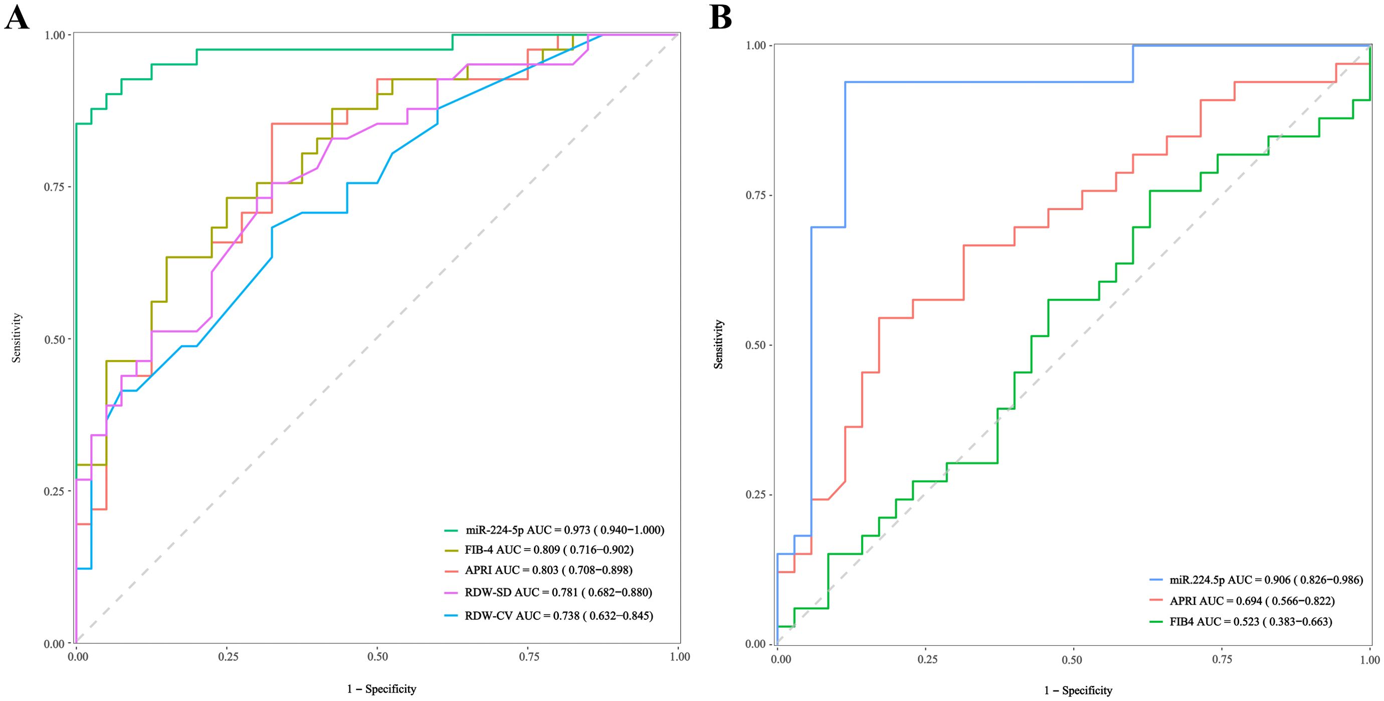 Figure 3. Diagnostic Performance of miR-224-5p and Conventional Biomarkers in the Training Set (A) and External Validation Cohort (B): (A) Receiver operating characteristic (ROC) curves for miR-224-5p, FIB-4, APRI, RDW-SD, and RDW-CV in the training set. The area under the curve (AUC) with 95% confidence interval (CI) is shown for each marker. (B) ROC curves for the same biomarkers in an independent external validation cohort.