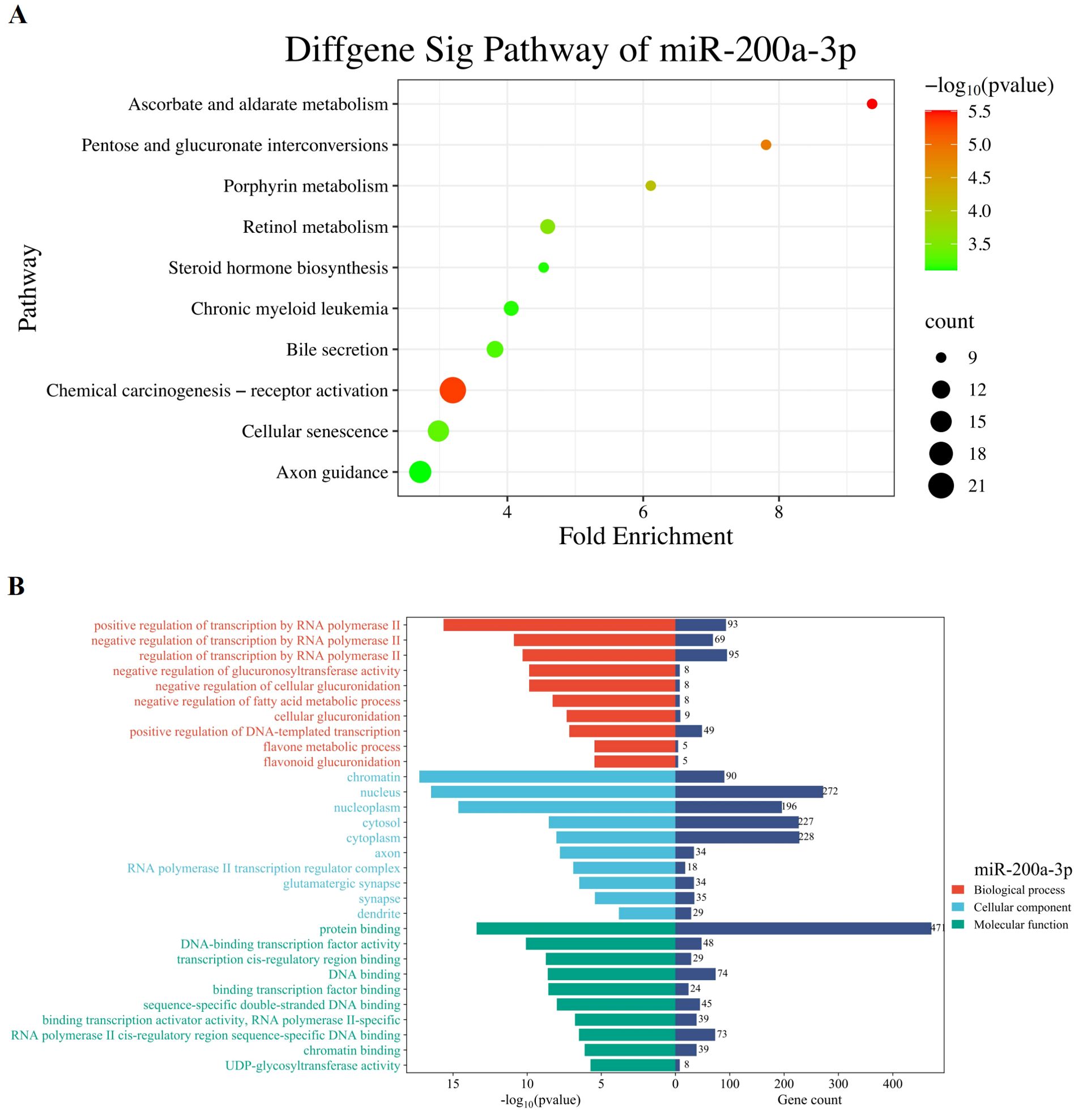 Figure 6. Enrichment analysis of target genes of DEMs miR-200-3p: (A) The top 10 KEGG pathways of miR-200-3p. (B) The 10 top enriched GO terms of miR-200-3p. BP, biological process; CC, cellular component; MF, molecular function. The P values of GO terms and KEGG pathways decrease from top to bottom.