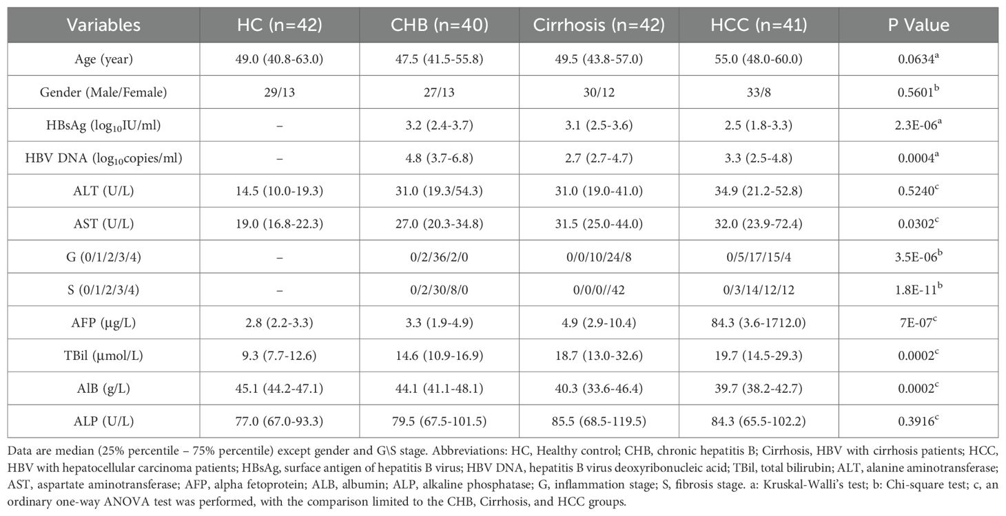 The study cohort comprised four clinically defined groups: HC, CHB, cirrhosis, and HCC, with the HC group serving as the reference control. No statistically significant differences were observed in age or gender distribution among the four groups (p > 0.05, Table 1). However, significant differences in HBsAg levels were detected among the CHB, cirrhosis, and HCC groups (p = 2.3E-06, Table 1), with the HCC group exhibiting markedly lower HBsAg levels compared to the other two groups. Similarly, HBV DNA levels differed significantly among these three groups (p = 0.0004, Table 1), primarily due to the higher viral loads observed in the CHB group. The ALT and AST levels were elevated in all HBV-infected groups compared to the HC group, with no or little significant differences observed among the three HBV-infected groups (CHB, cirrhosis, and HCC) (Table 1, Supplementary Figure 1AB). Based on the histological grading and staging criteria (G/S classification), the majority of CHB patients were classified as G2, reflecting mild inflammatory activity. Cirrhosis patients were predominantly distributed across stages G2 - G4, whereas HCC patients were primarily categorized within grades G1 - G4. Notably, the liver inflammation grade was significantly higher in the cirrhosis group compared to both the CHB and HCC groups (Table 1, Supplementary Figure 1C). In terms of fibrosis staging, the majority of CHB patients were classified as S2, indicative of mild fibrosis, while cirrhosis patients were all categorized as S4, representing advanced fibrosis. HCC patients exhibited a broader range of fibrosis stages from S2 to S4, with cirrhosis patients demonstrating the highest fibrosis staging among all HBV-infected groups (Table 1, Supplementary Figure 1D). AFP levels exhibited a gradual increase across the four groups, with the highest levels detected in the HCC group. Significant differences in AFP levels were noted between the HCC group and each of the other groups (Table 1, Supplementary Figure 1E). Additional data on other liver function parameters, including albumin (ALB), total bilirubin (TBil), and alkaline phosphatase (ALP) are also provided (Table 1, Supplementary Figures 1F–H).