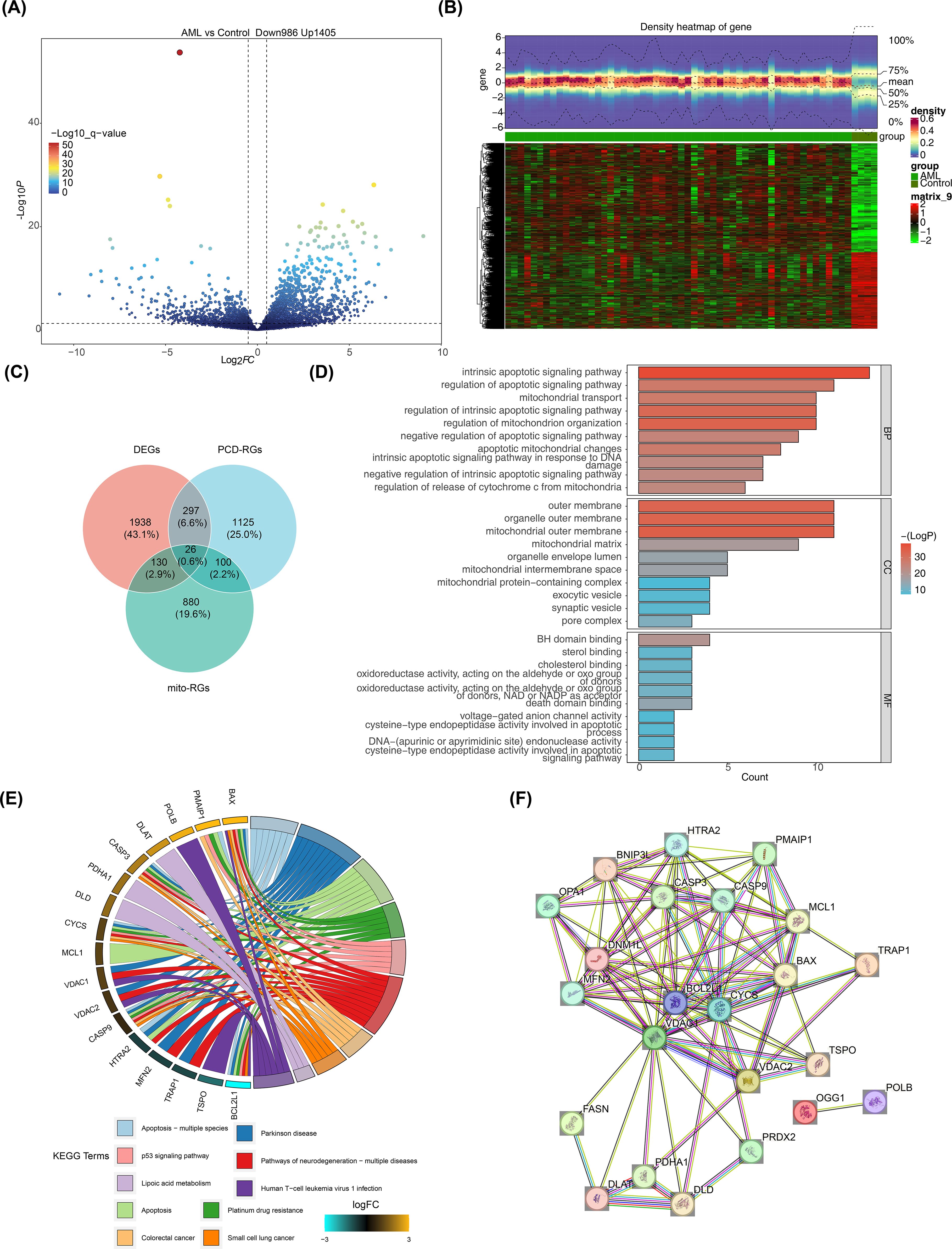 (A) Volcano plot showing differential gene expression in AML versus control, with specific genes highlighted by LogFC and adjusted p-value. (B) Density heatmap illustrating gene expression patterns in AML and control groups. (C) Venn diagram showing overlap between DEGs, PCD-RGs, and mito-RGs. (D) Bar charts of enriched pathways and GO terms related to apoptosis and mitochondria. (E) Circular diagram depicting KEGG pathway enrichment related to various biological processes, color-coded by logFC. (F) Network diagram highlighting protein-protein interactions among key genes, illustrating their functional associations.
