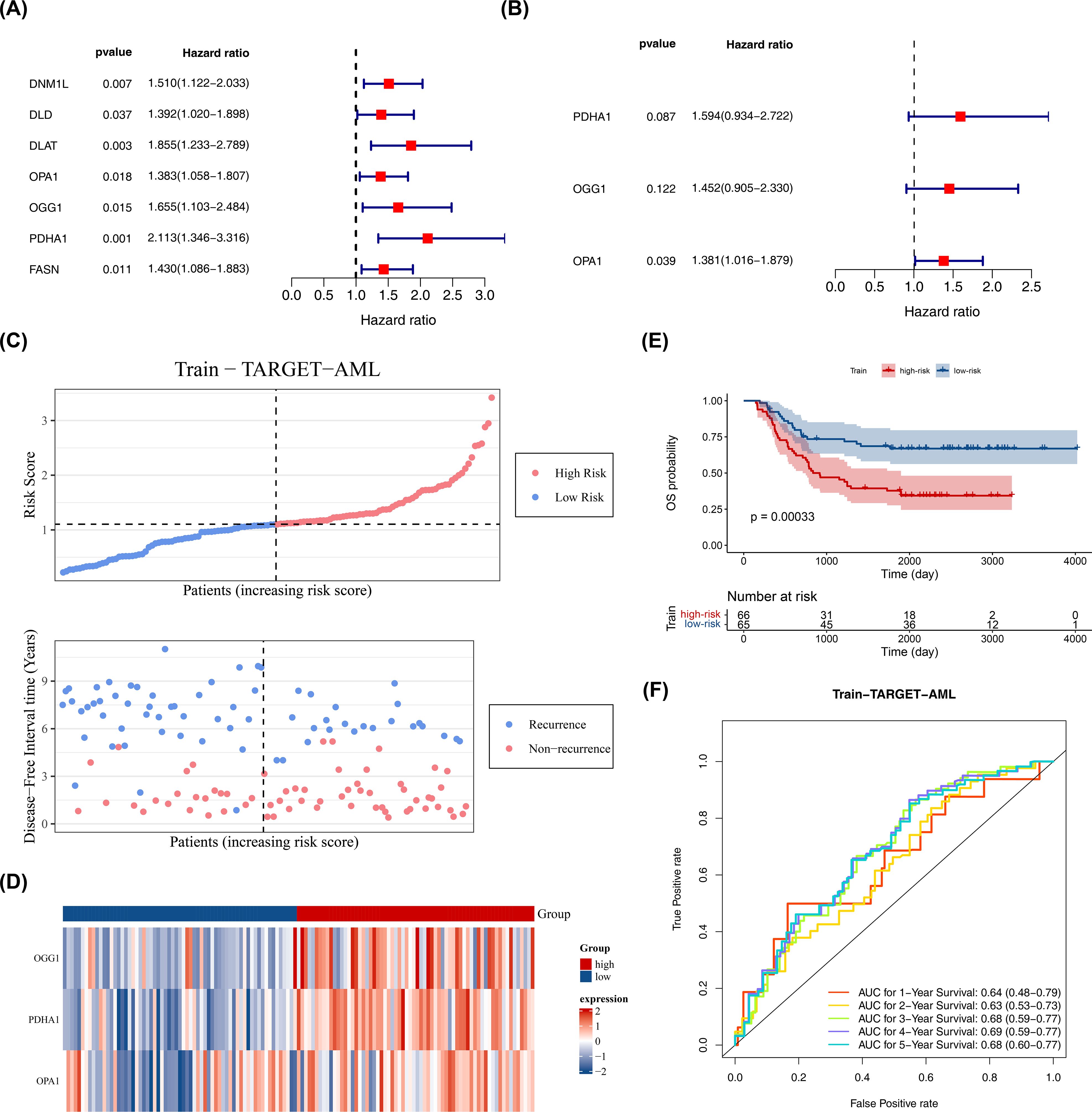 Graphical analysis related to AML risk prediction: (A) Forest plot showing hazard ratios for various genes, with significance denoted by p-values. (B) Hazard ratio plot for specific genes with p-values. (C) Graph detailing risk scores for patients, distinguishing between high and low risk, alongside recurrence data. (D) Heatmap illustrating expression levels of genes OGG1, PDHA1, and OPA1, segregated by risk group. (E) Kaplan-Meier survival curve comparing high-risk and low-risk groups. (F) Receiver operating characteristic curves depict AUC for survival predictions at different intervals, with the x-axis showing false positive rates and the y-axis showing true positive rates.
