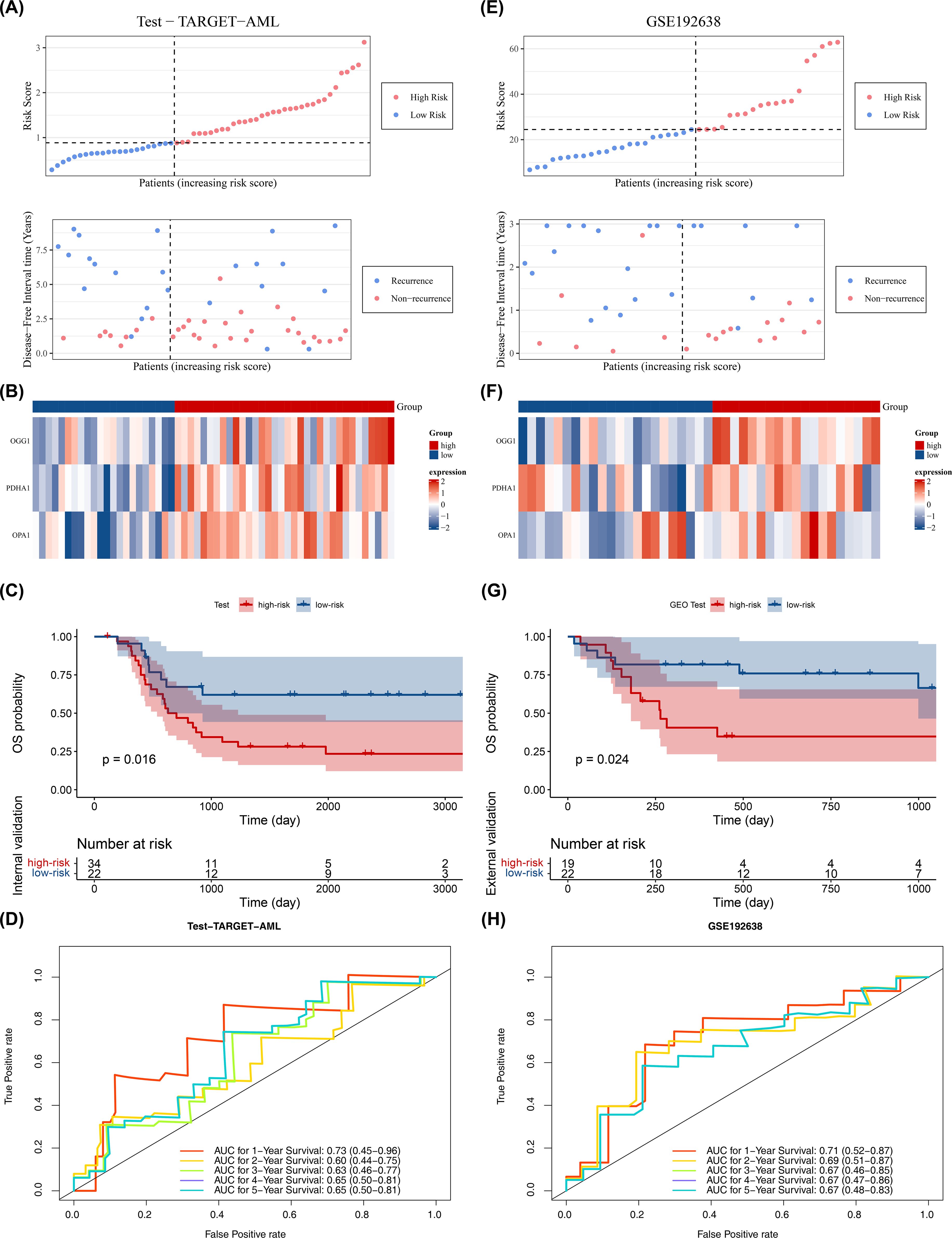 Charts show data on risk scores, gene expression, and survival rates for patients in TARGET-AML and GSE192638 groups. Panels A and E display risk scores and disease-free intervals. Panels B and F show gene expression heatmaps. Panels C and G illustrate overall survival probabilities with time, highlighting high-risk versus low-risk groups. Panels D and H present receiver operating characteristic curves with area under the curve (AUC) values for survival prediction.