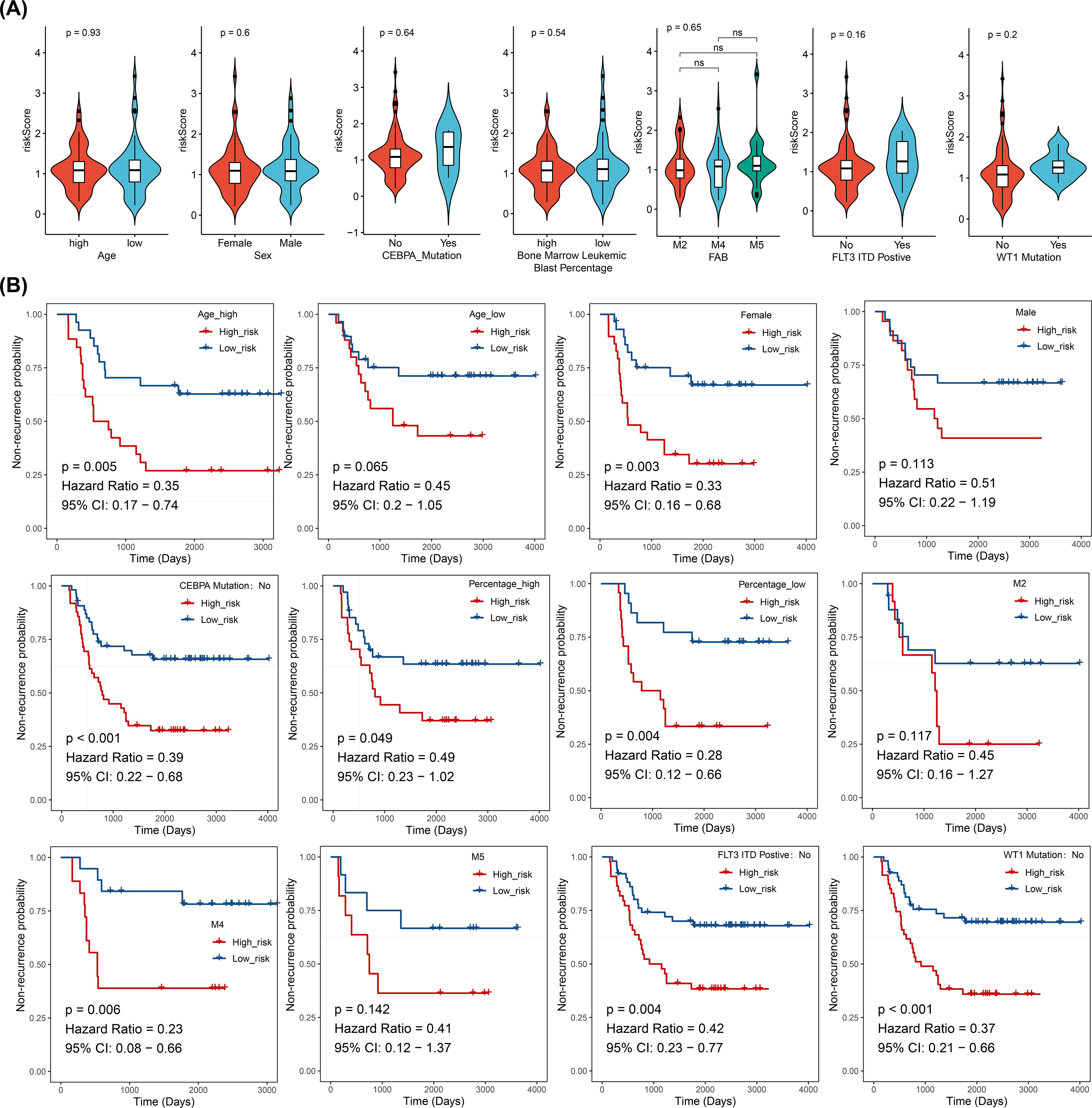 Panel A shows violin plots comparing nRiskScore across different categories: age, sex, CEBPA mutation, bone marrow leukemic blast percentage, FAB classification, FLT3 ITD positivity, and WT1 mutation. Panel B presents Kaplan-Meier survival curves for non-recurrence probability over time, with separate charts for different risk factors such as age, sex, and mutations, demonstrating hazard ratios and p-values.