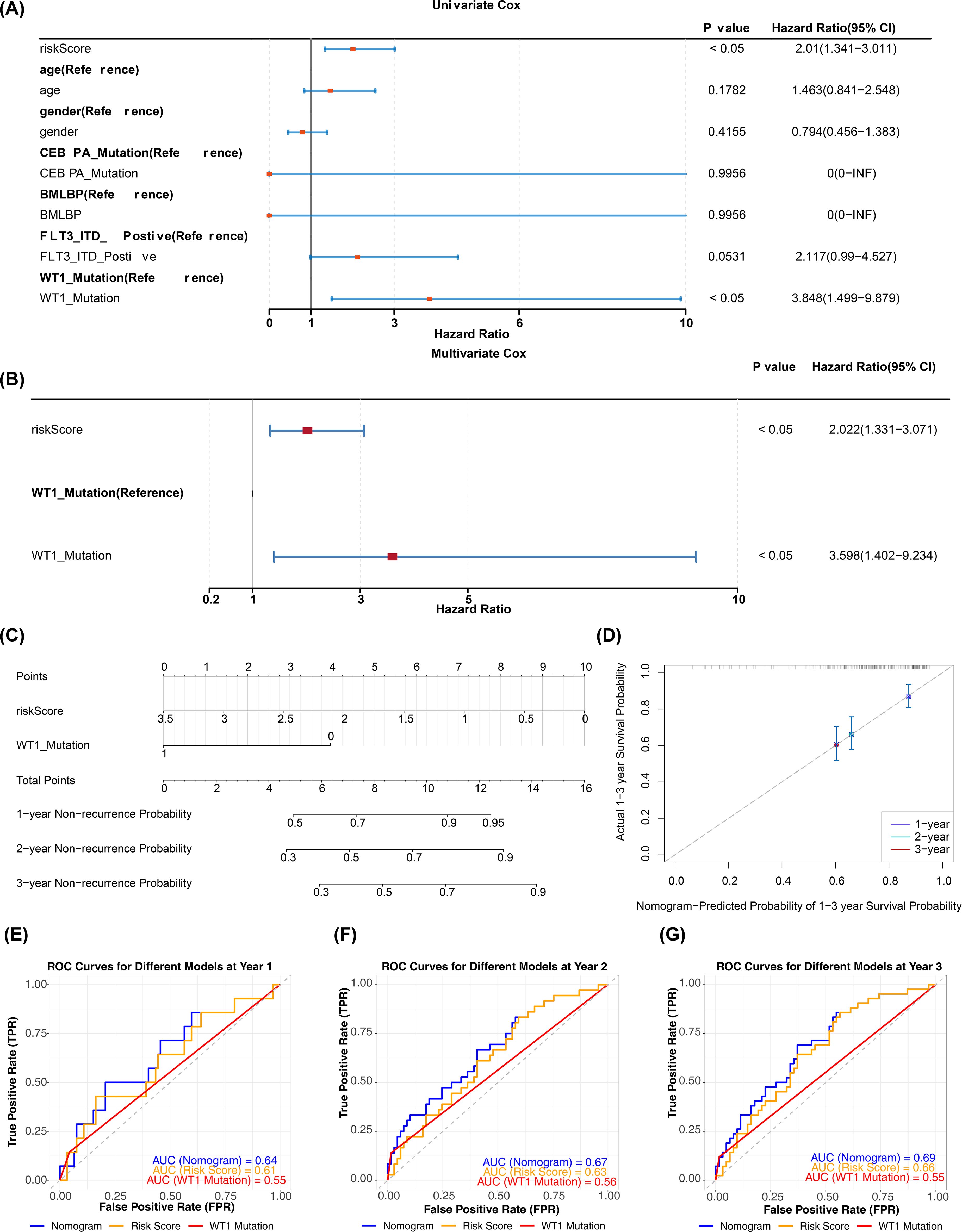 Figure 5. Construction and validation of nomogram. (A, B) Univariate and multivariate Cox regression analyses combining clinical variables and risk score (HR, 95% CI, p values). Variables with p < 0.05 in multivariate analysis were considered independent prognostic factors. PH assumption tested for each model (p > 0.05 indicates satisfied). (C) Nomogram incorporating independent prognostic factors (risk score and WT1 mutation) to predict 1-, 2-, and 3-year overall survival. (D) Calibration curves comparing predicted vs observed survival at 1, 2, and 3 years; calibration assessed by 1,000 bootstrap resamples. (E–G) ROC curves for independent prognostic factors and the nomogram at 1, 2, and 3 years (time-dependent ROC); AUC values and 95% CIs are reported.