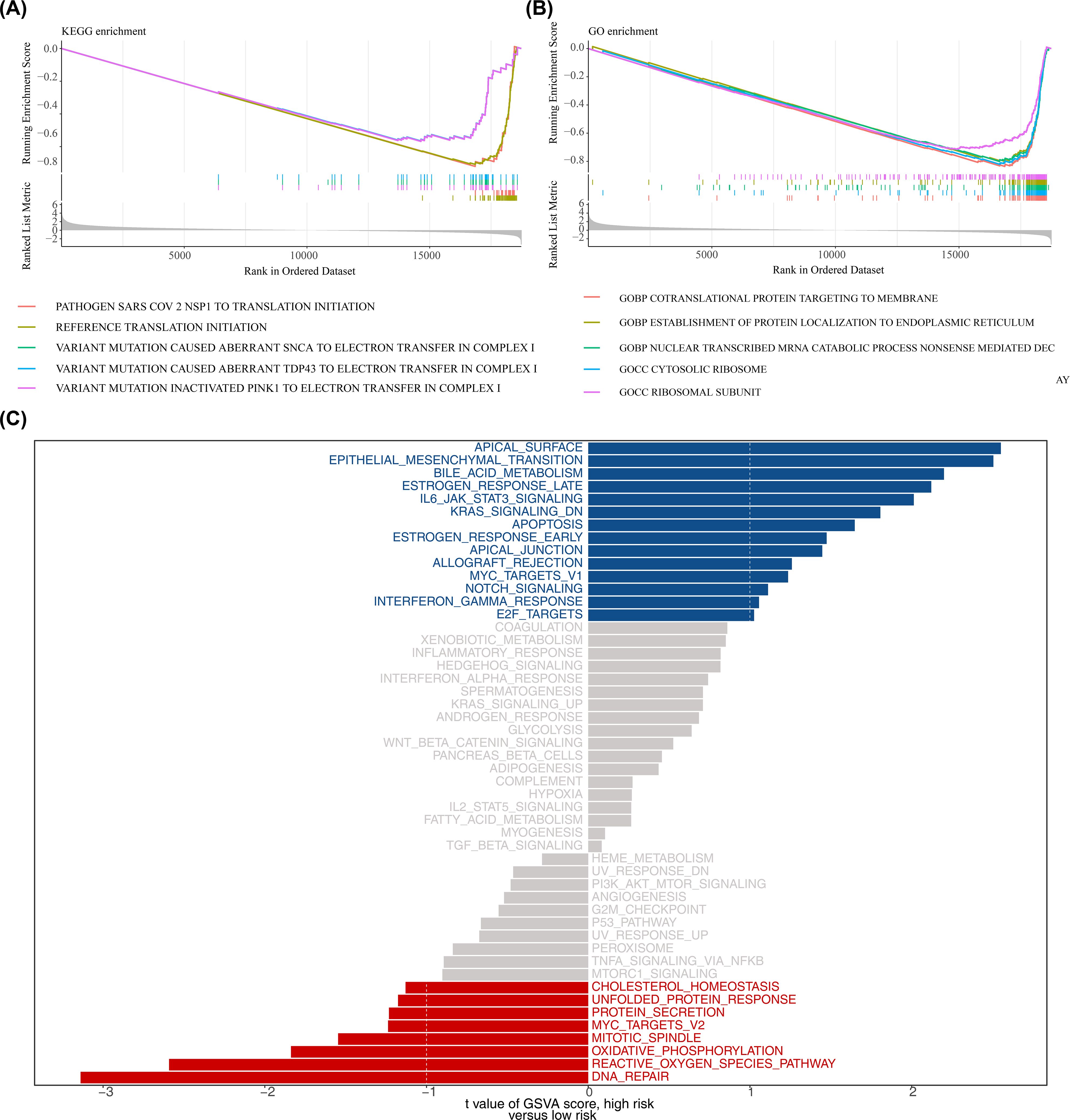 In the high- and low-risk groups of the training set, based on the KEGG gene set (c2.cp.kegg_medicus.v2023.2.Hs.symbols.gmt) from GSEA analysis, some pathways, such as reference translation initiation, were then observed (Figure 6A; Supplementary Table 7). GO gene set (c5.go.v7.4.symbols.gmt) analysis identified processes like cotranslational protein targeting to the membrane (Figure 6B; Supplementary Table 8). Additionally, GSVA analysis indicated that apical surface and epithelial-mesenchymal transition (EMT) pathways were activated in the high-risk group, while DNA repair pathways were activated in the low-risk group (Figure 6C; Supplementary Table 9). The findings of this study suggested that DNA repair and epithelial-mesenchymal transition may play a role in specific risk groups; however, given the small sample size and potential cross-platform bias in this study, the reliability of this conclusion requires validation in future studies with larger sample sizes.